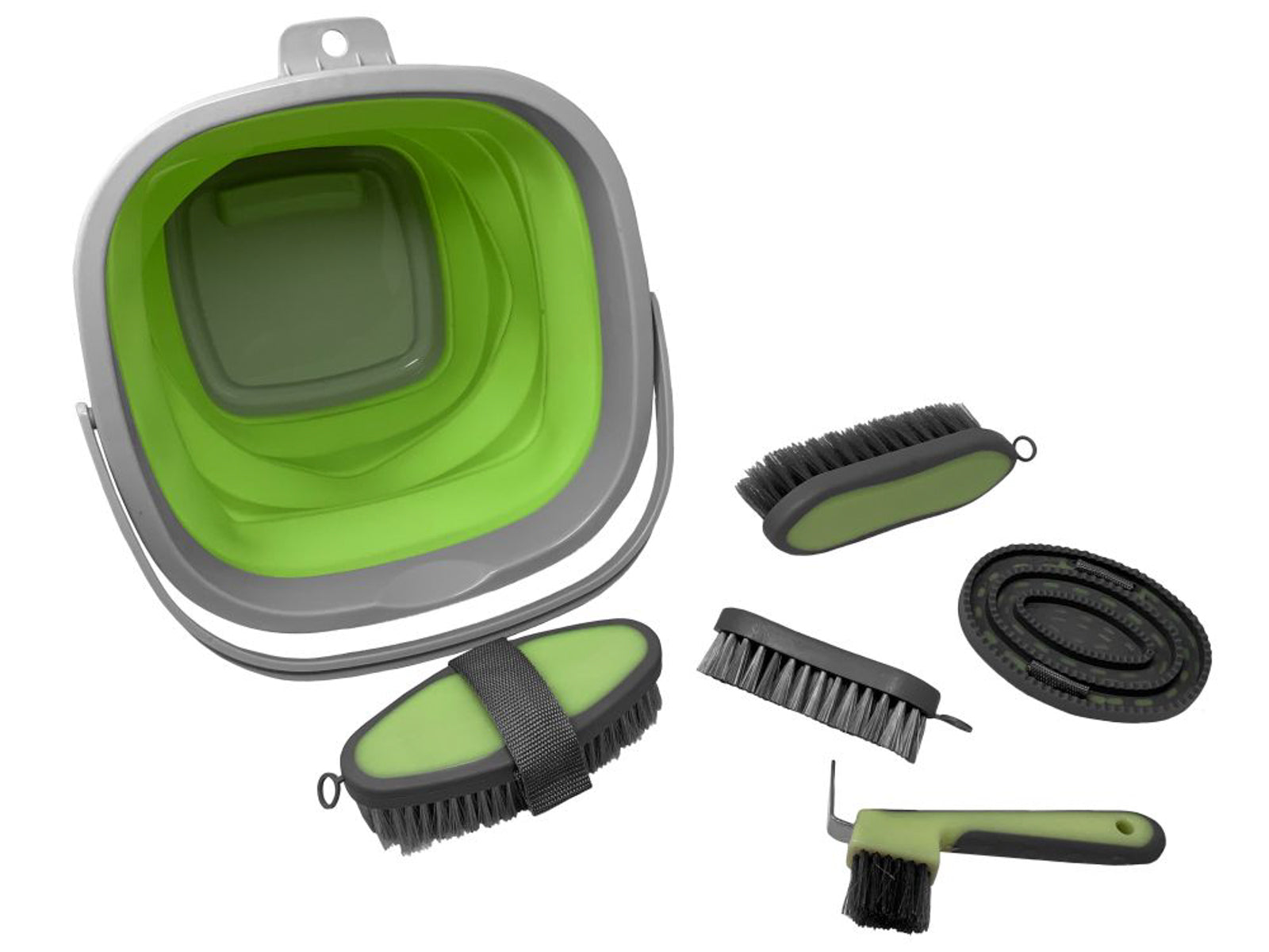 5-Piece Grooming Kit with Collapsible Bucket has essential tools to keep your horse clean.