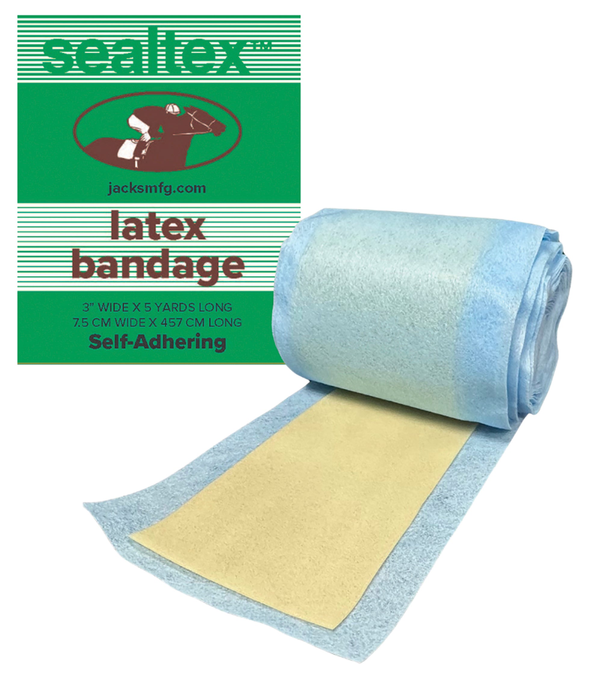 Jack's Sealtex™ Latex Bandage is the best wet-track bandage on the market! The self-sealing bandage is the only bandage completely unaffected by water. Without a weave or mesh to become clogged with mud, this bandage will not absorb water whatsoever when used on a wet track. Soft, yet tough and durable with no fasteners of any type required. Sealtex sticks solidly to itself–yet to nothing else. It won’t loosen and it lasts!