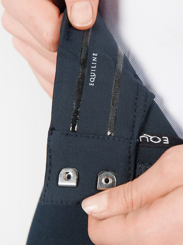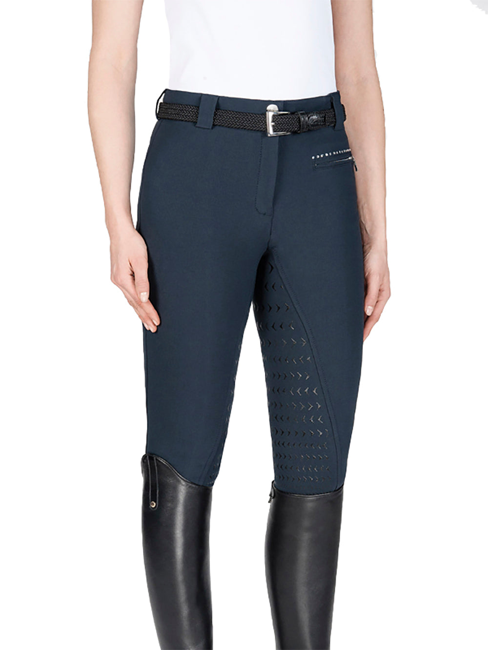 An ergonomic cut at the pressure points of this elegant breech boosts your riding comfort. Dainty crystals accent the front-zip pocket and the back. Equiline’s flexible X-Grip silicone print full seat allows your freedom of movement and supports your in-saddle stability.