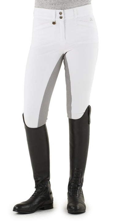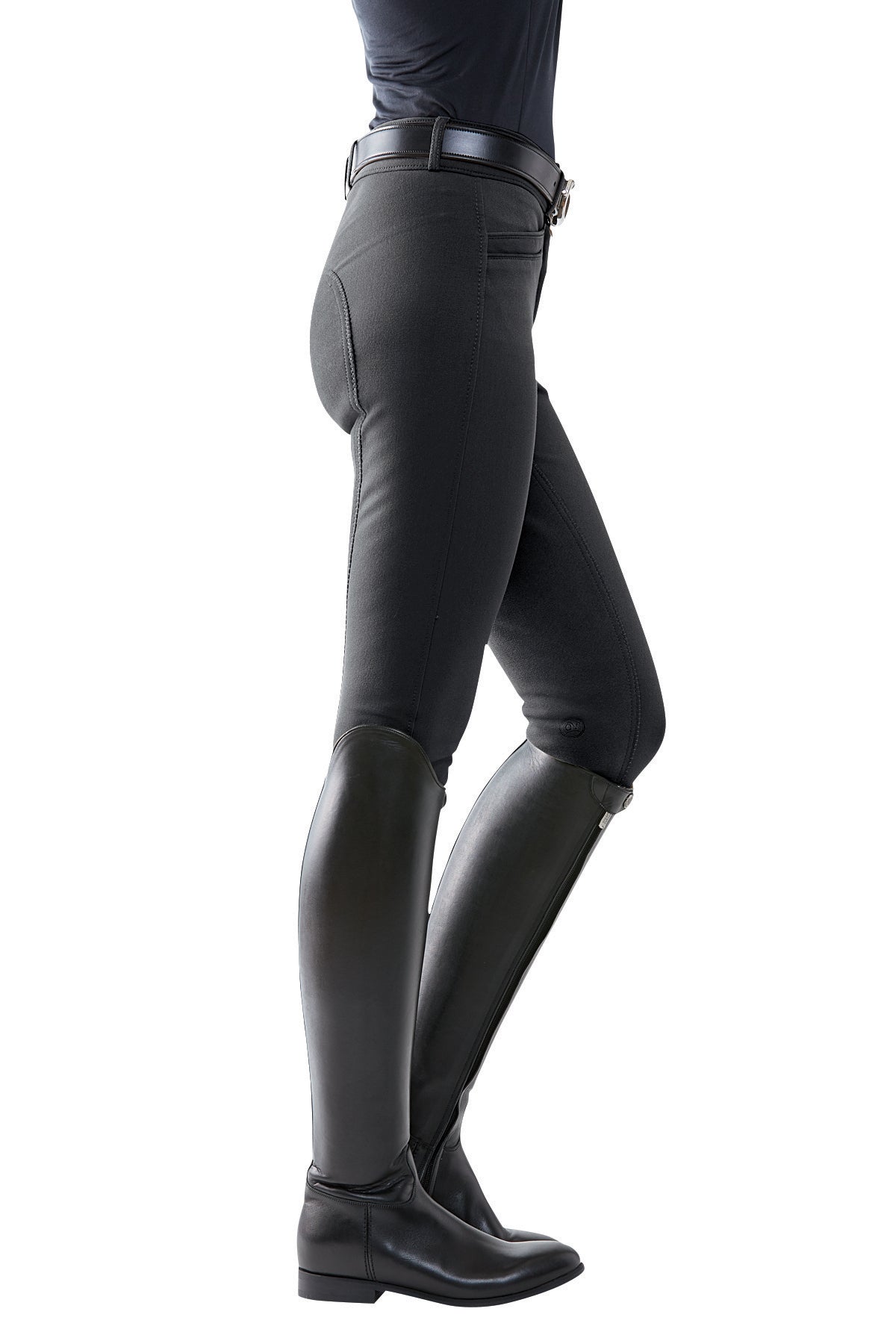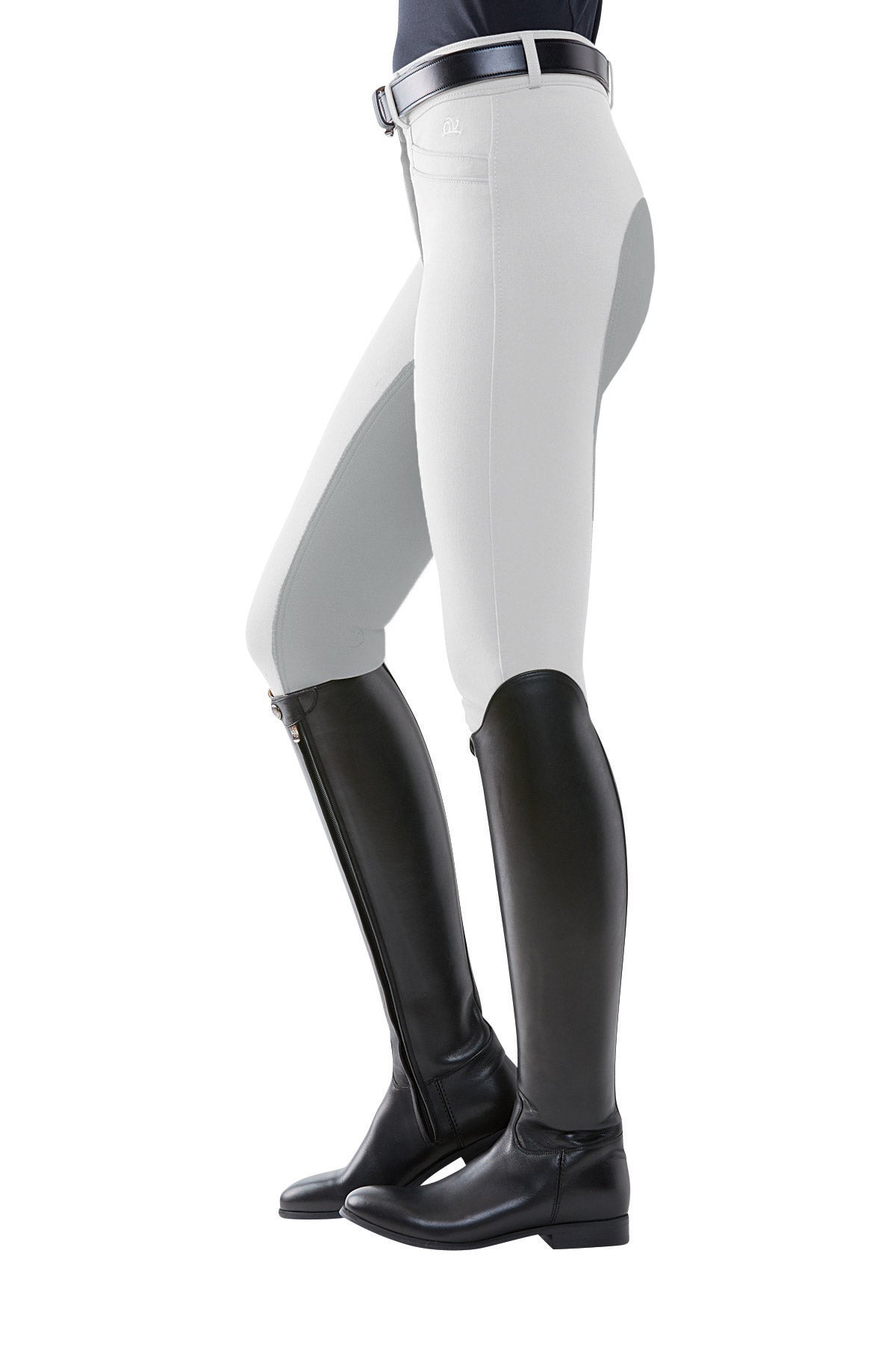 This breech features a mid rise, front zipper with a double-slide clasp closure for a clean look, fancy double pocket detail, Syn-Tec™ Stretch Suede™ full seat and Dry-Tex™ Tube Bottoms™ for a comfortable fit under your tall boots. The non-pinching waistband gently hugs you in all the right places. A Dry-Tex® inner skin keeps you cool and dry.