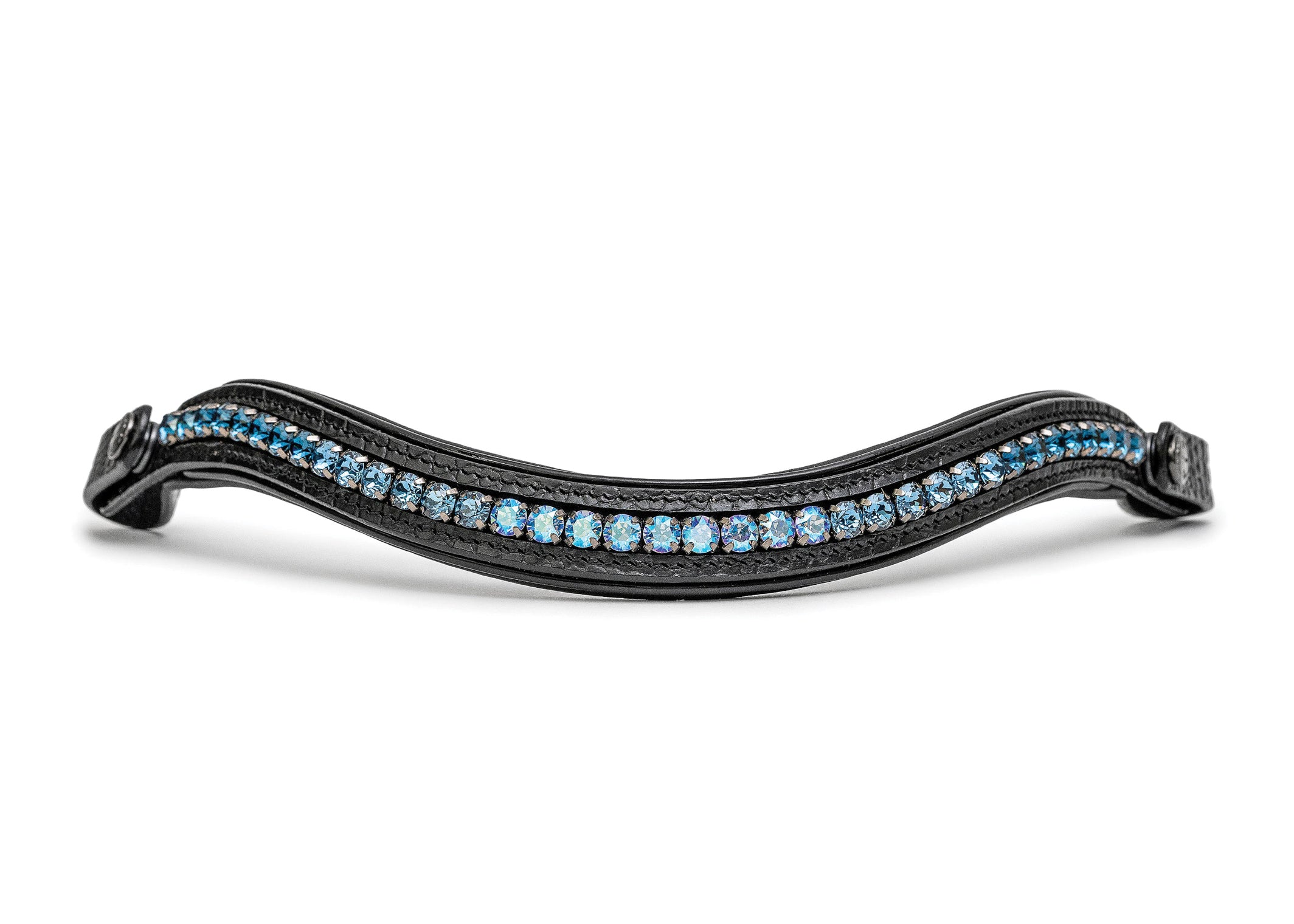 The ultimate in sophistication and innovation, The Halter Ego® Doc Marten Snaffle Bridle with a new invisible, removable flash. The black snaffle bridle is simply stunning and features elegant black crocodile printed leather on the anatomical noseband and browband. Plush black Nappa padding with black patent piping and a scintillating ombre crystal design adorn the browband. The anatomical crownpiece and buttery soft padding on the noseband provide ultimate comfort for your horse. Includes luxury rubber grip lined reins with hand stops. Full size reins are 56" long x 1/2" wide.