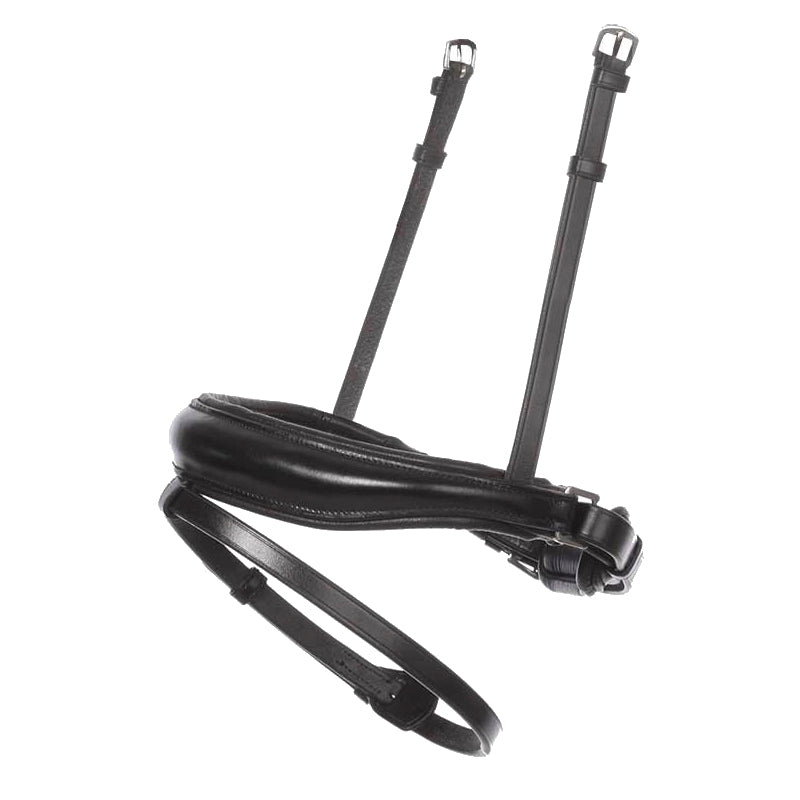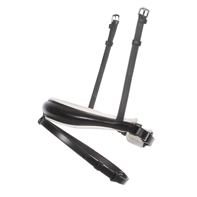 The Kavalkade Charlotte Flash Caveson is a replacement noseband for the plain leather Charlotte snaffle bridle. The hanger buckles on both sides to work with the single crownpiece design. Crafted of black leather in a refined design, it tapers on both sides to avoid contact with bit rings. Choose white or black padding.