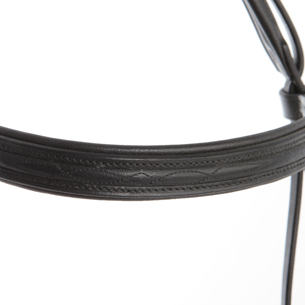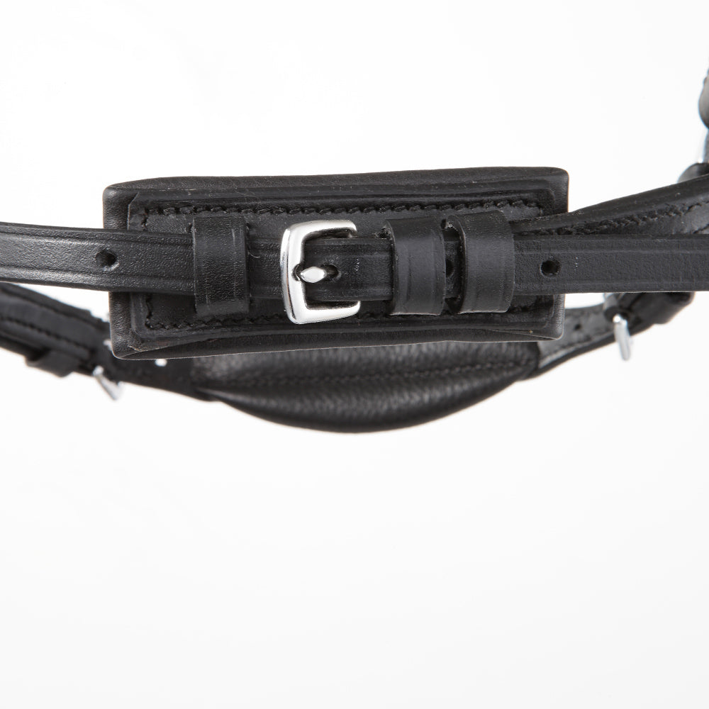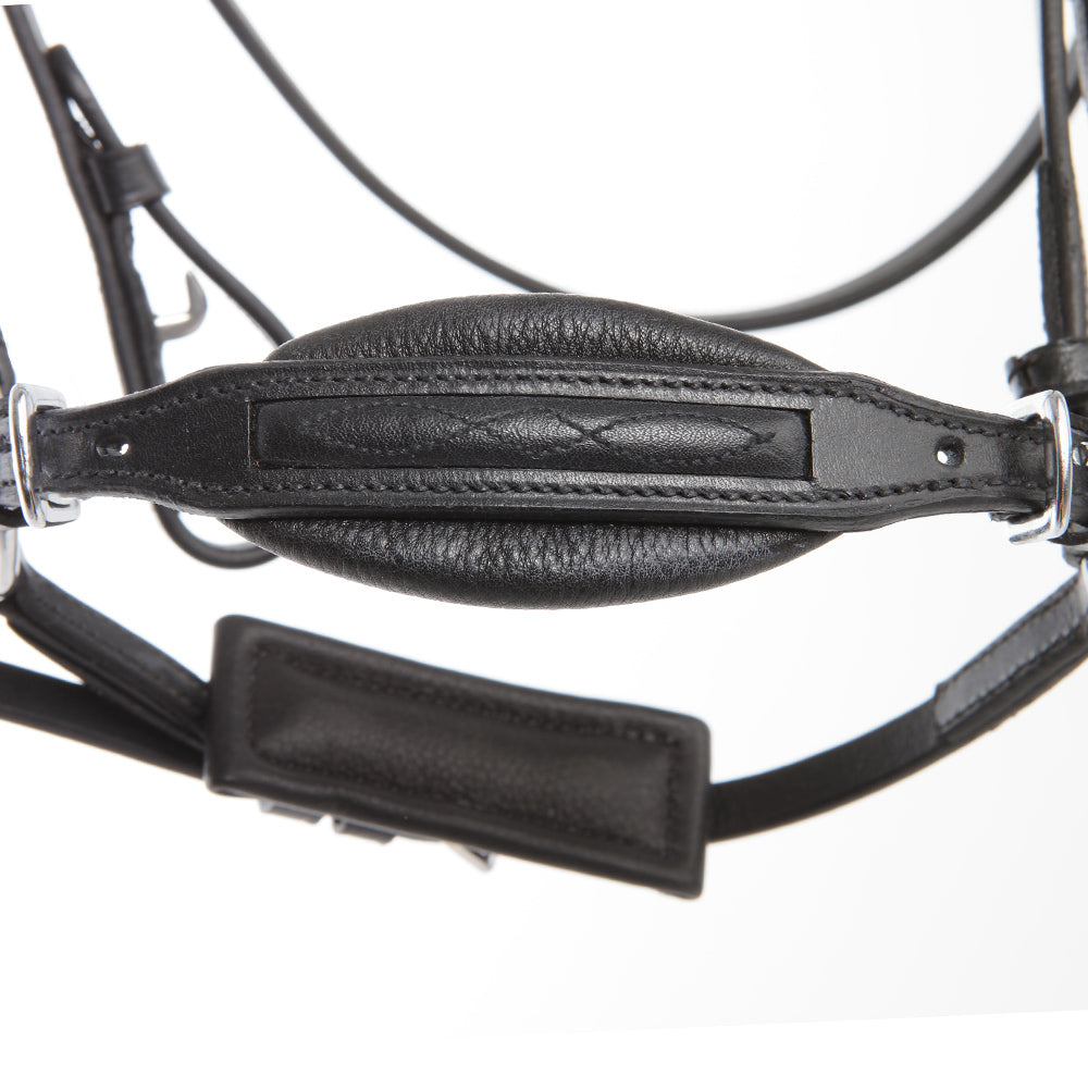 Additionally, to reduce pressure, the noseband hanger runs over the top of the crown. Leather insets embellish both the straight brow and nose.