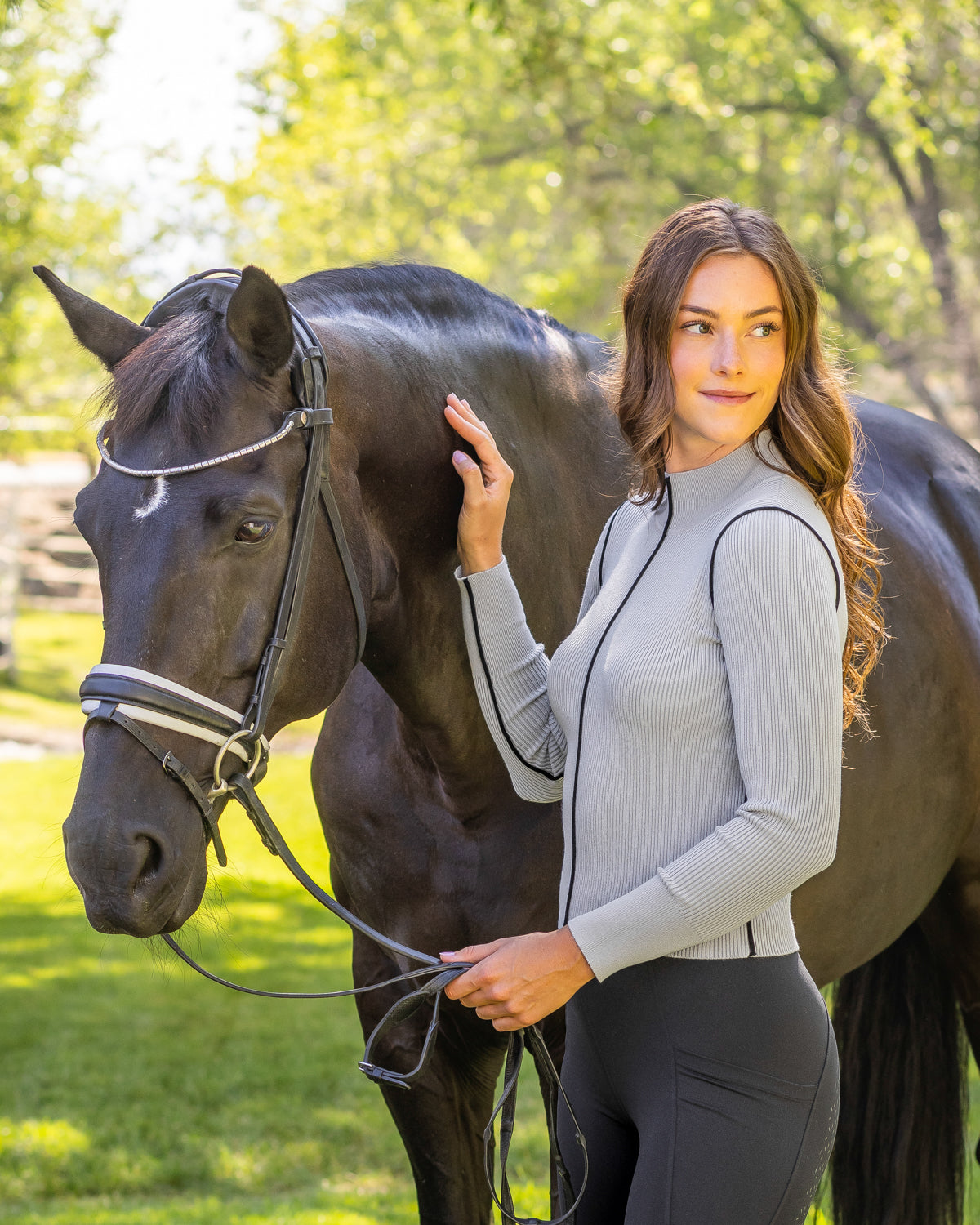 Kastel Denmark Ladies’ Mock Neck Knit Sweater is ready for all your riding needs. Dalia debuts with a black, sporty piping for an elevated look. Tailored fit with a mock neck and super soft, lightweight rib knit fabric that keeps you looking great all season long.