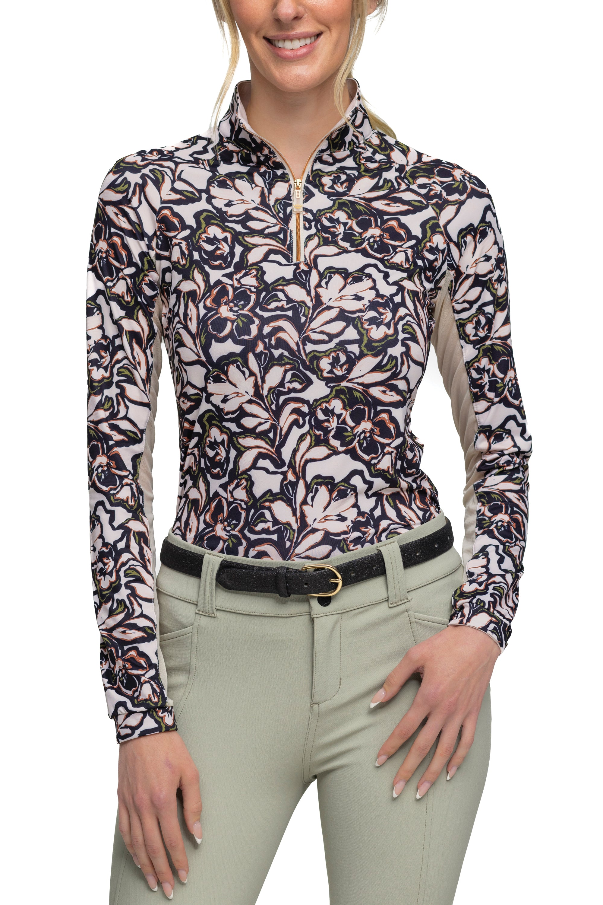 The Kastel Denmark Eloise Long Sleeve Shirt is soft, breathable and stretchy. UPF 30-rated fabric with antibacterial odor control is covered in a contemporary floral with black, olive and touches of rust on a cream background.