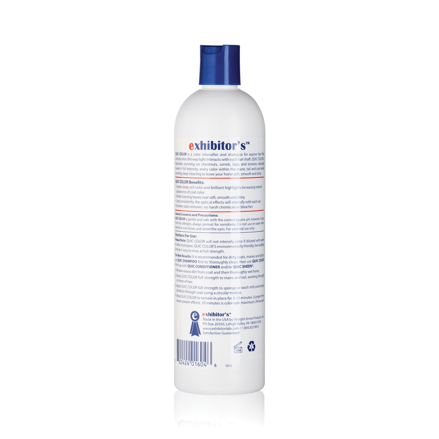 Exhibitor’s™ Quic Color® horse shampoo contains the legendary formula that continues to intensify and brighten with unrivalled performance. Quic Color naturally reveals the full intensity of every copper and chestnut color within a horse’s coat, mane and tail. It optically alters the way light interacts with each hair shaft, creating stunning coats on chestnuts, sorrels, bays and browns. Quic Color provides a deep and gentle cleaning that will leave your horse’s coat soft, smooth and shiny. 16 ounces.