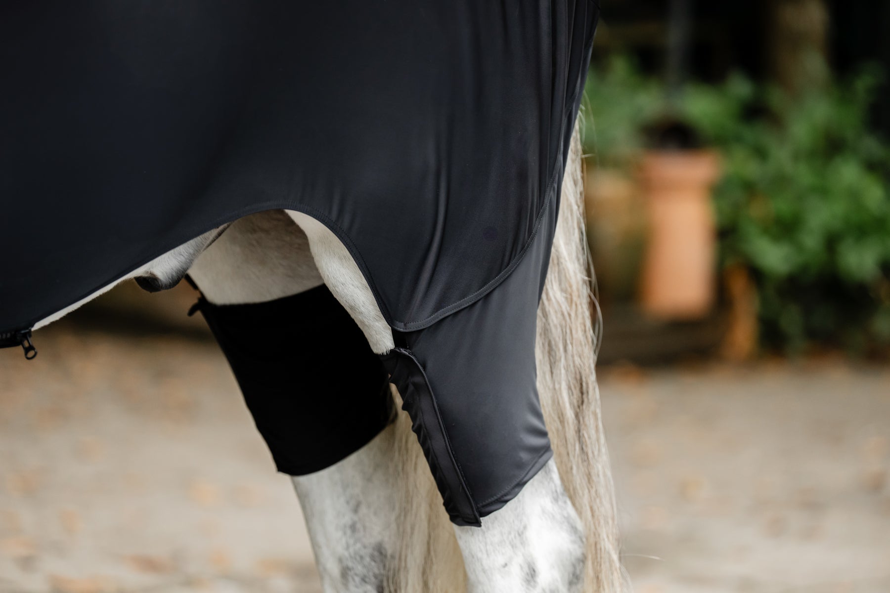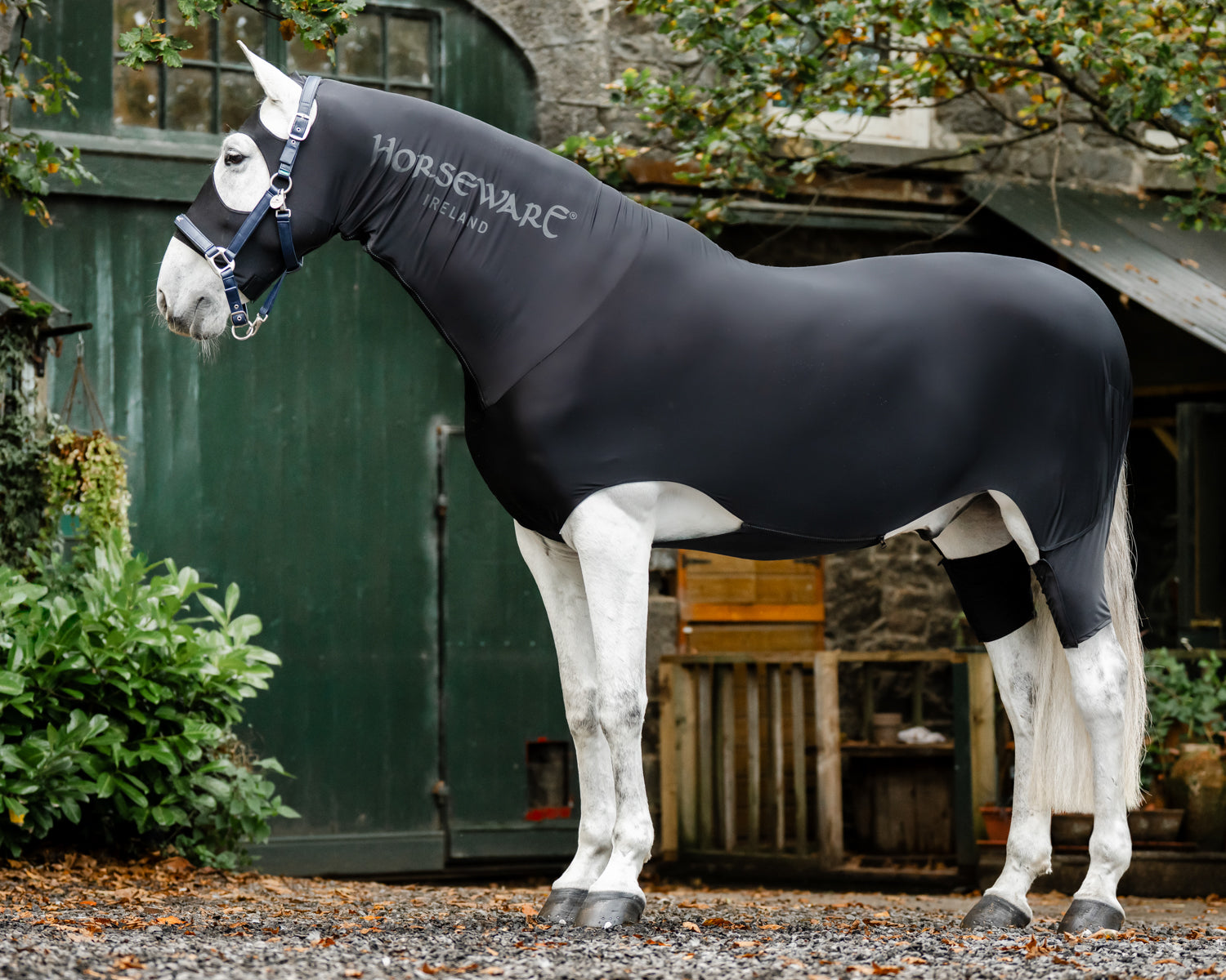 Keep your show ring shine all day long with the Horseware® Ireland Rambo® Slinky Full Body. Made from shine boosting Lycra with an anti-static treatment for a smooth and glossy coat. Contoured fit with full body coverage including face, neck, belly, hind quarters and stifle area with front and back leg arches for comfort and feedom of movement. Easy to use zip system with reinforced zip guard for face, neck, under chest and belly flap with a simple Velcro closure for the hind legs.