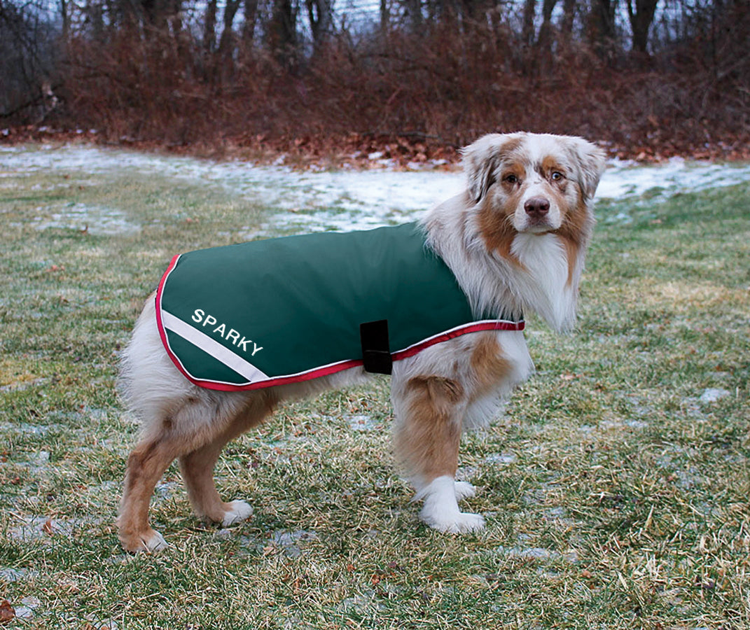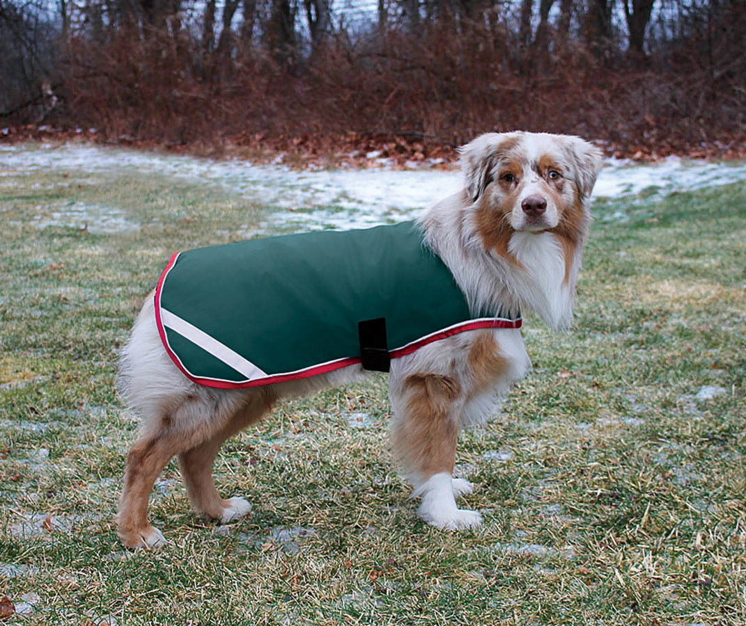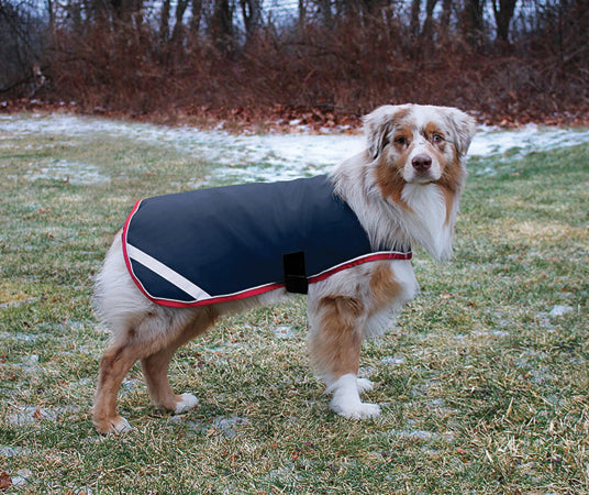 An adjustable front allows the blanket to fit many shapes of dogs, and front leg arches ensure freedom of movement. Reflective piping for enhanced visibility. Elasticized surcingle for a snug fit.