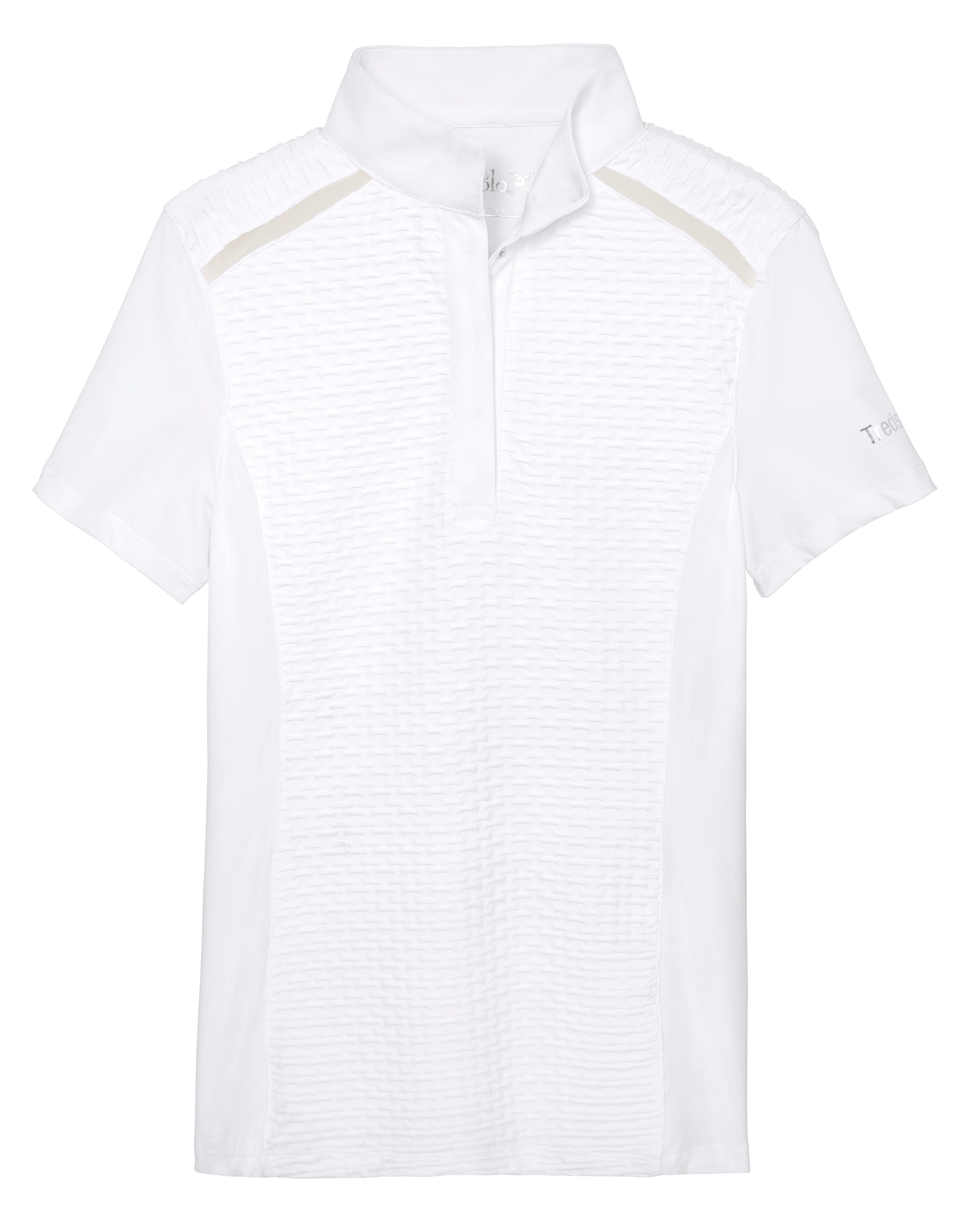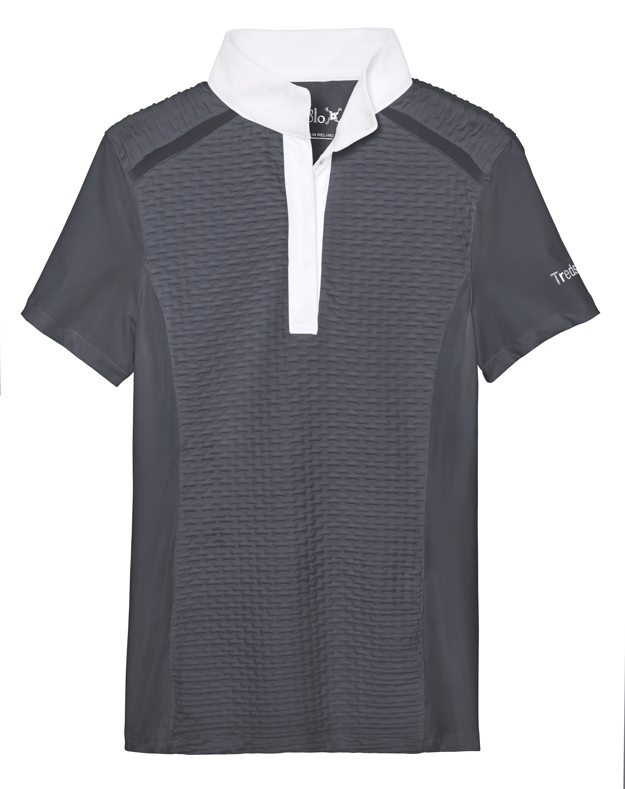 The Tredstep™ Solo Pearl Show Shirt adds contemporary twists to classic show styling with textural front, back and shoulder panels and mesh inserts along raglan shoulder “seams.” Lightweight stretch panels at the sides and sleeves ensure your freedom of movement. A ventilation grommet at the nape lets heat escape. Stand collar and covered placket for a polished presentation.