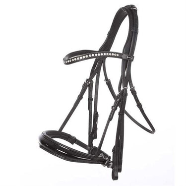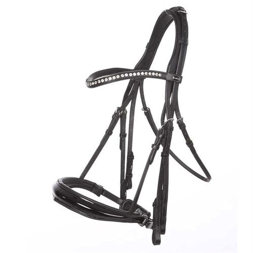 The Kavalkade Antonia Patent Leather Double Bridle features a softly padded and shiny crank noseband that 1.754" wide at center. An anatomically cut and lightly padded crownpiece avoids your horse’s ears. Large white rhinestones make the curved browband sparkle. Crafted of high-quality German leather, this bridle includes two sets of reins (1/2" wide plain and 5/8" wide with hand stops).