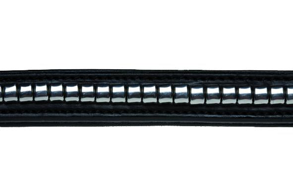 Classic silver-colored clinchers on the padded browband add a touch of flair. Features chrome fittings, buckle ends and includes a set of 3/4" wide web reins with hand stops and buckle ends. Black.