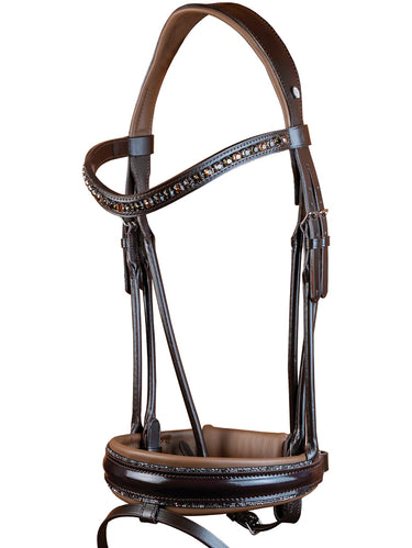 The beautifully appointed Otto Schumacher Bellevue Snaffle Bridle features a chocolate patent leather noseband with cappuccino padding and brown crystal trim. Designed for comfort, the noseband is fully padded, including under the crank closure.
