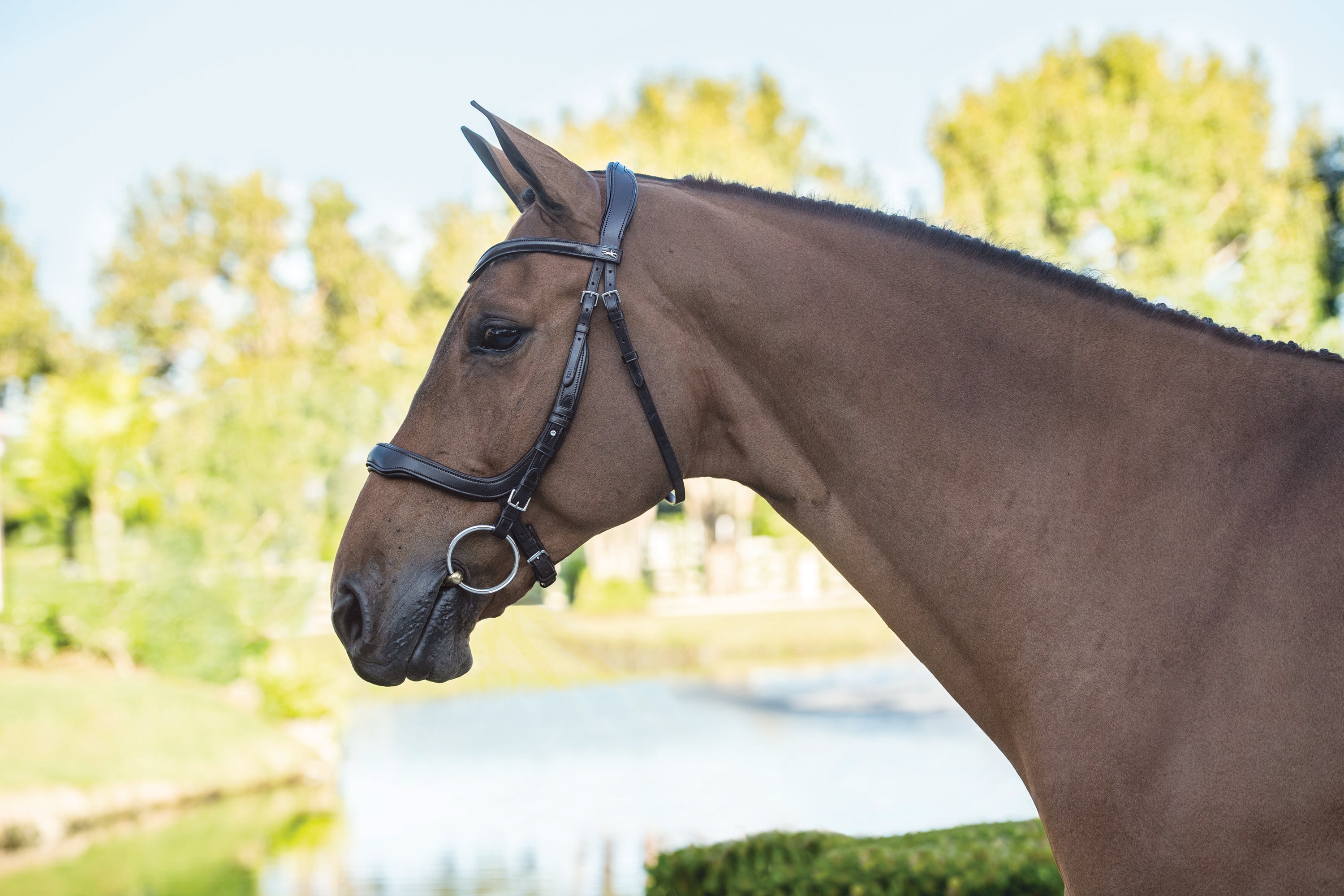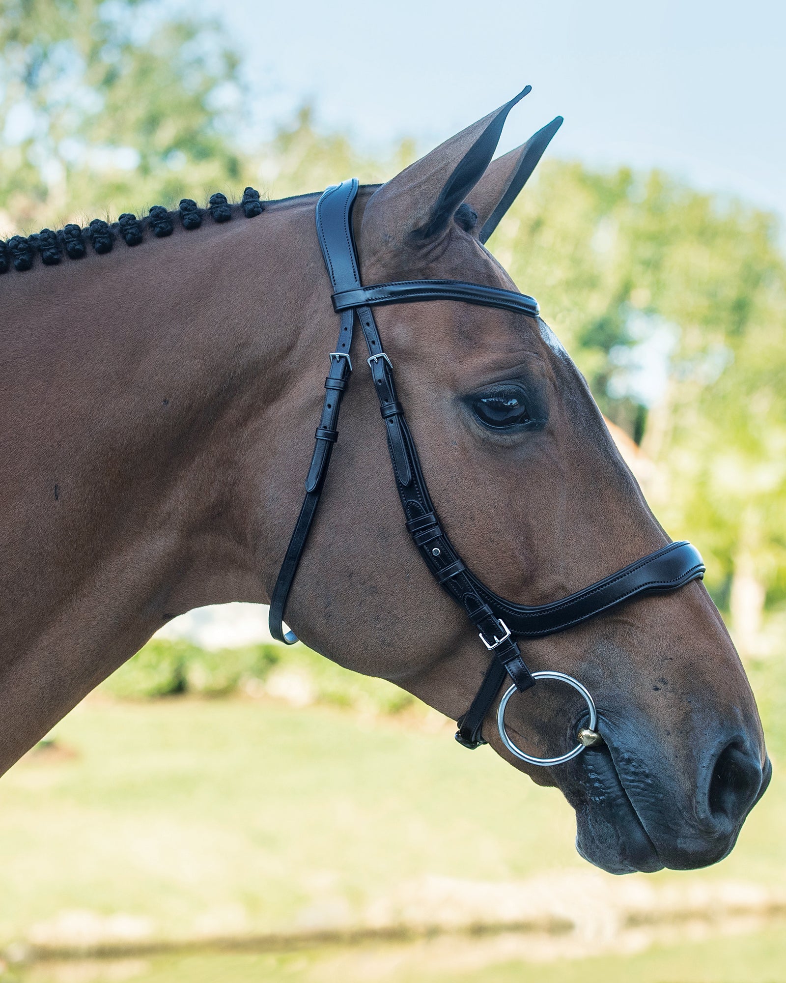 - Softly padded, contoured single crownpiece that avoids pressure at the backs of the horse’s ears.