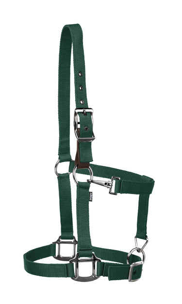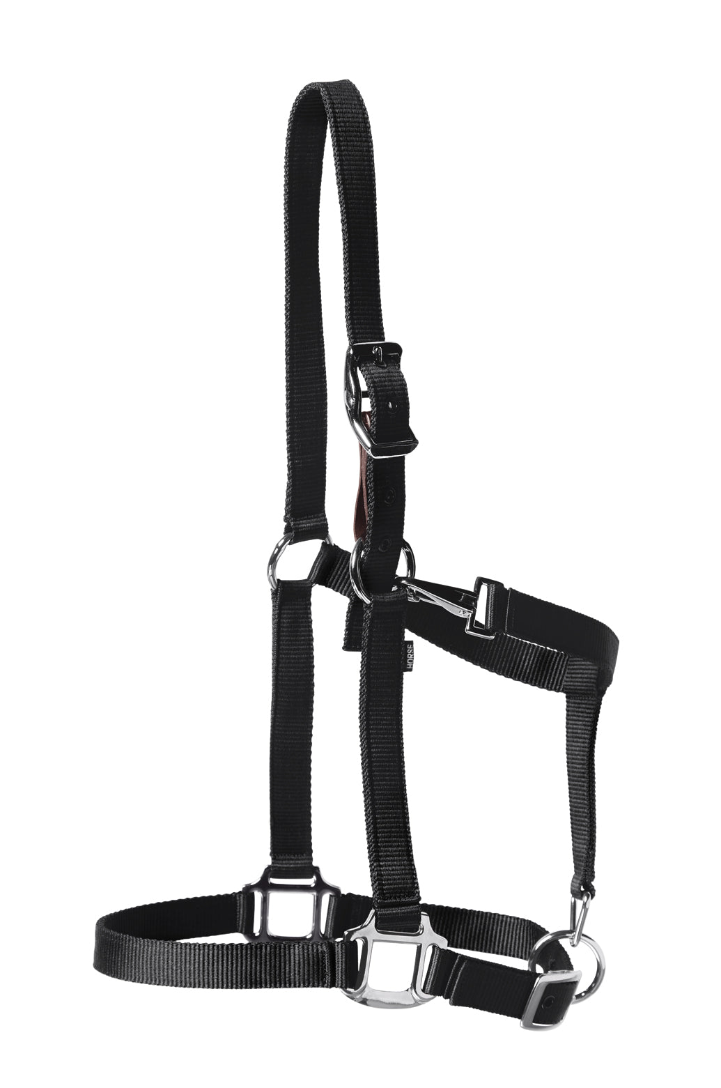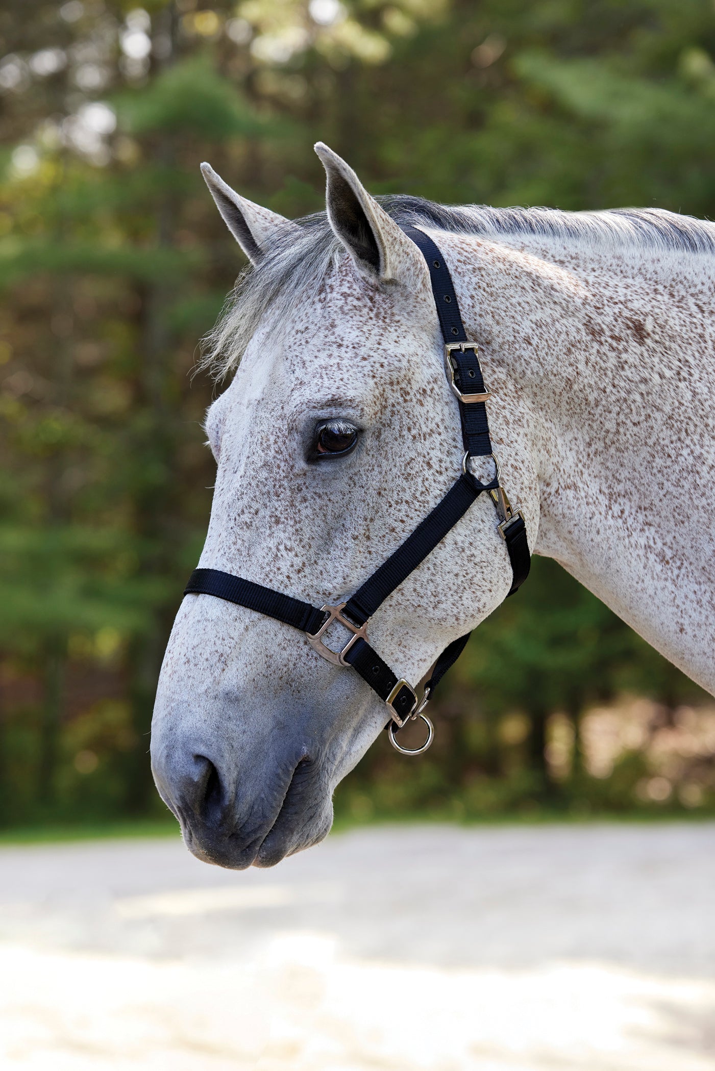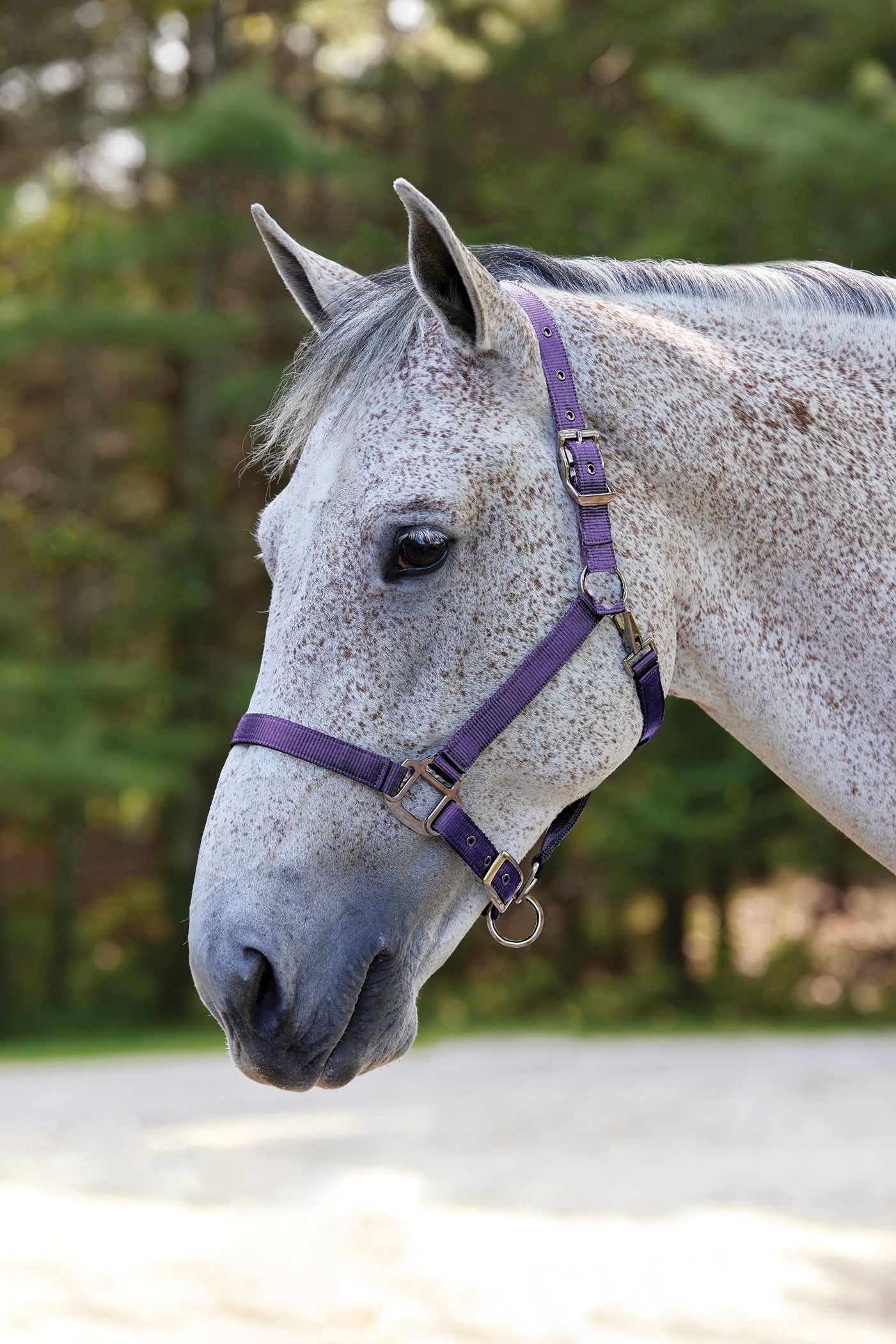 Designed to offer peace of mind, the Suffolk™ Nylon Breakaway Halter has a replaceable leather tab. This double-ply poly/nylon web halter has a single-buckle crown, adjustable chin and snap throat.