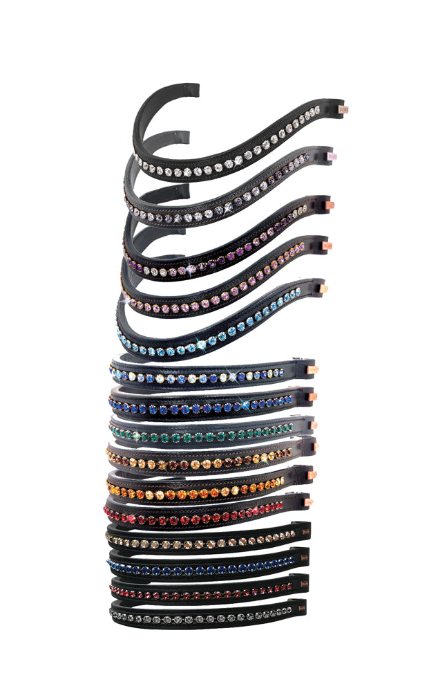 Each browband is handmade by skilled craftsmen from quality, soft leather and finished by hand in the USA with a shimmering row of genuine Swarovski® Crystallized Elements. Loops are generously sized to fit most bridles. Each arrives in a beautiful dust bag, perfect for storage or gift giving and includes a soft toothbrush to clean in and around crystals.