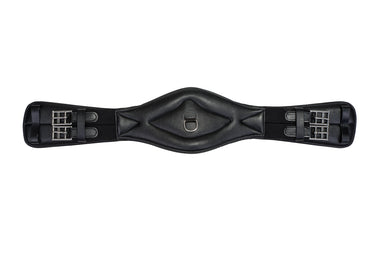 The Flex Rider® Comfort Leather Dressage Girth features a wide sternum pad to distribute pressure. It narrows toward the horse’s elbows to reduce interference. Super-soft leather with comfortable foam padding makes this an excellent girth for training and shows. D-Ring in center allows attachment of training aids. Elastic ends with stainless steel roller buckles make adjusting easy. Black.