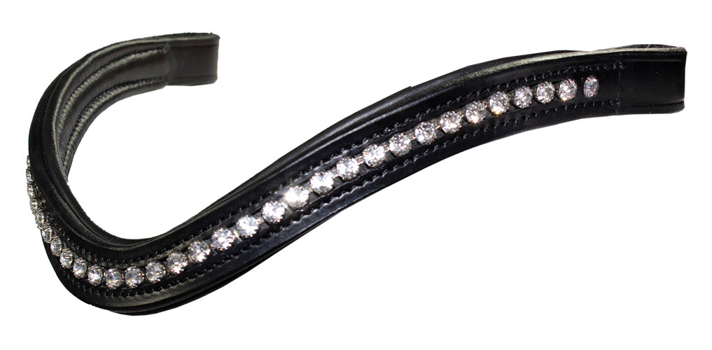 The KL Select Prix Curved Crystal Browband is a lovely and comfortable curved design in padded black leather. Clear crystals in silvertone settings line the center, adding elegance with a touch of sophisticated sparkle.