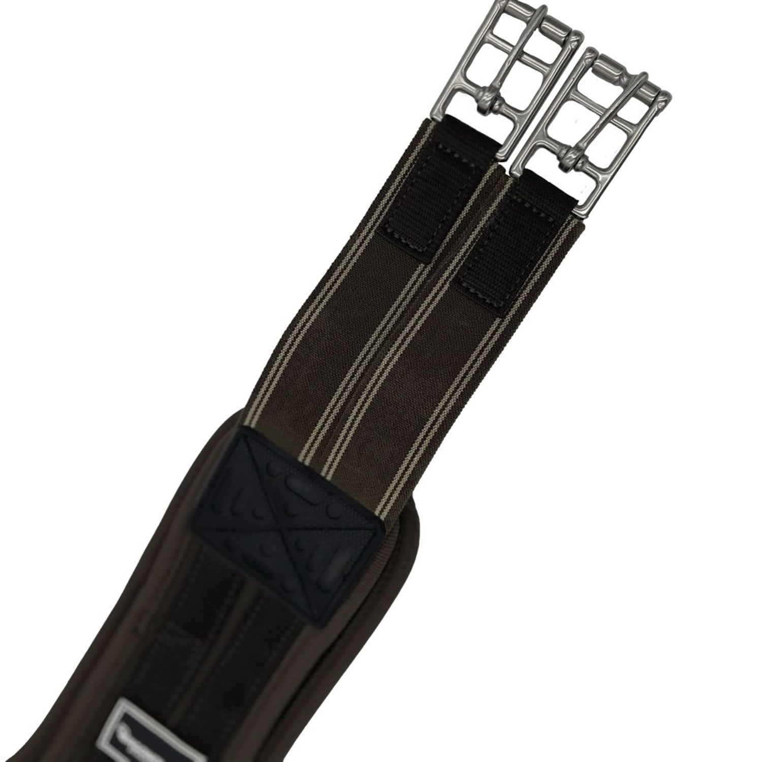 This girth features a stabilizing, protective center plate. D-ring can be used with training aids; buckle attachment for a martingale. Stainless steel buckles and elastic fittings allow a range of adjustments.