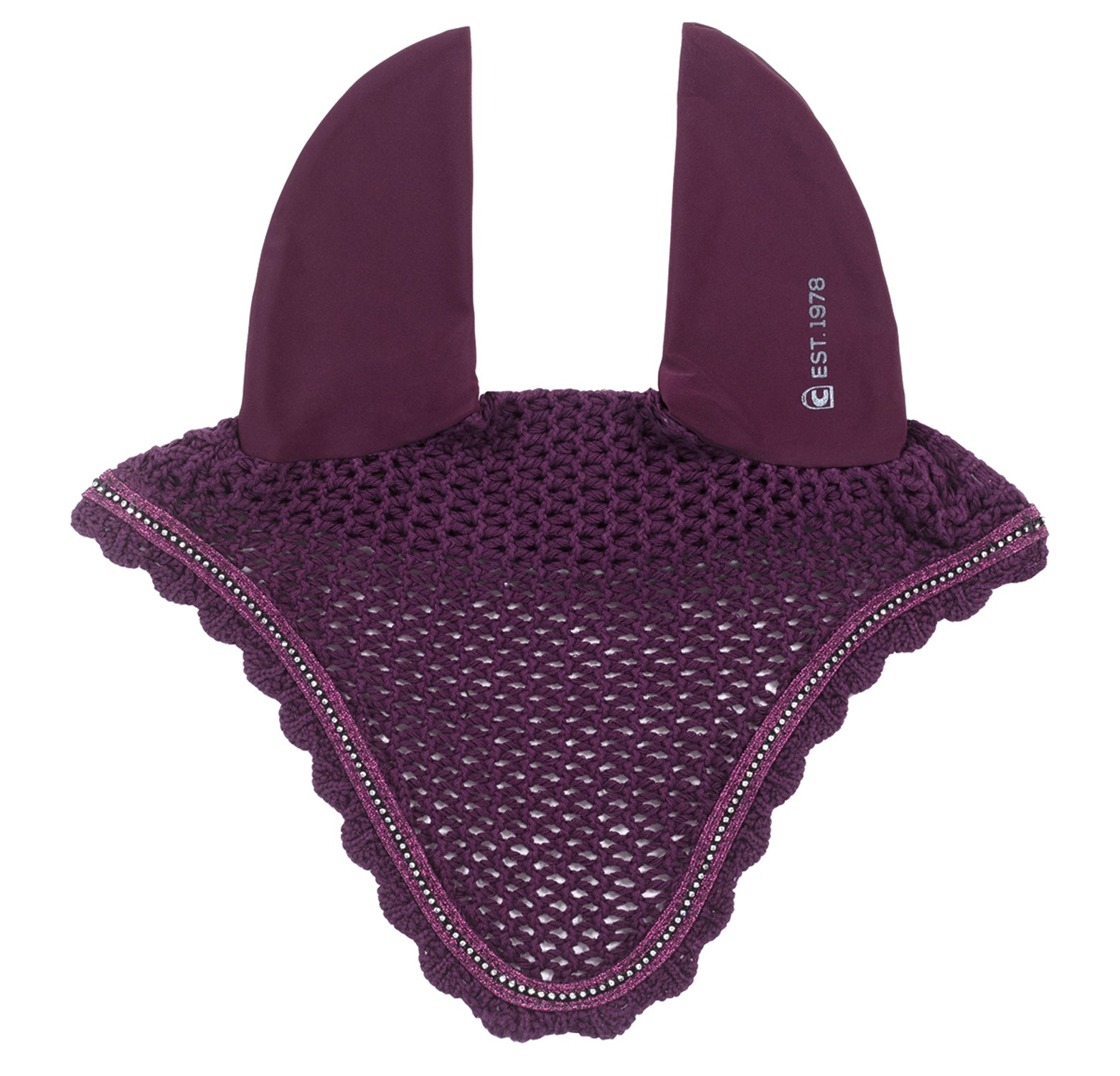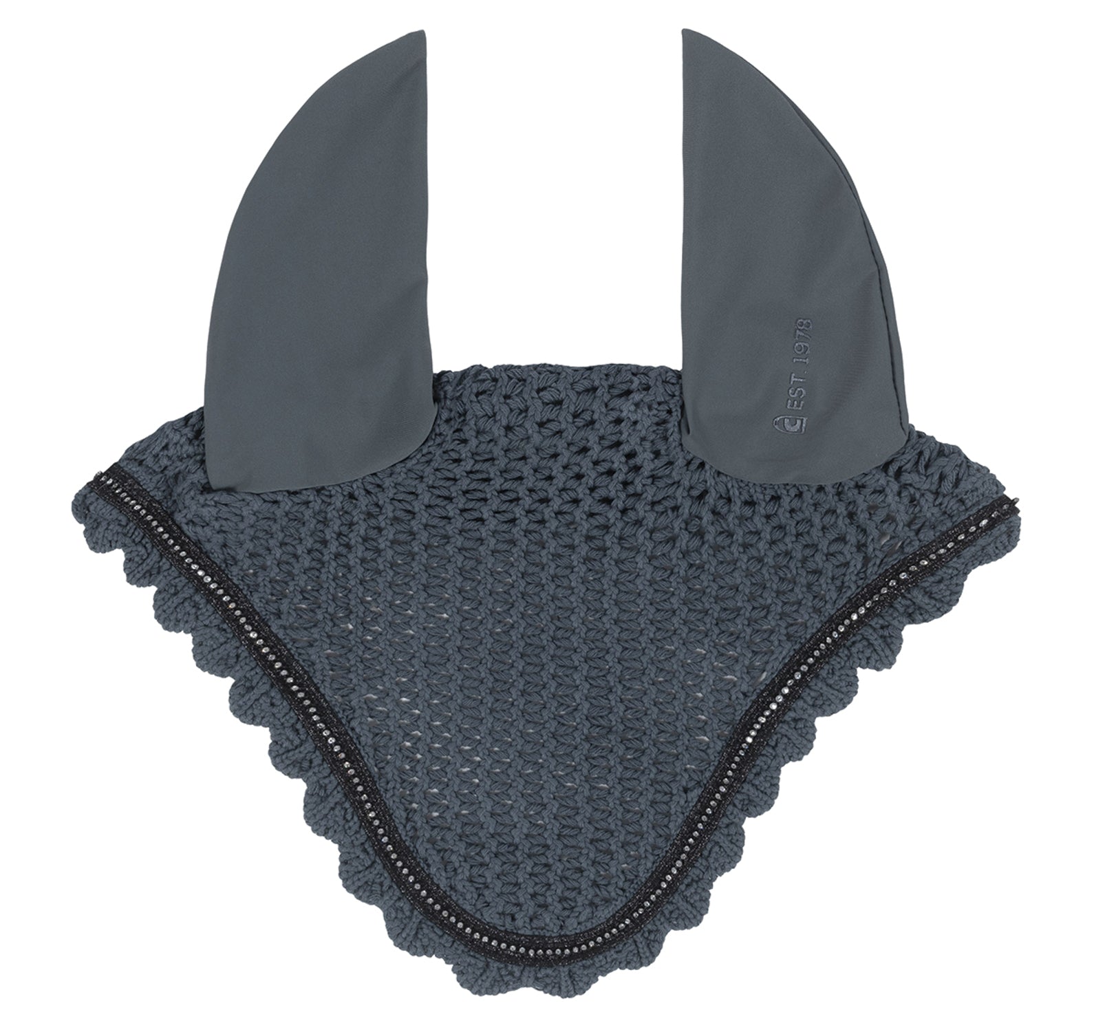 The Cavallo® Jetty Fly Veil enhances your horse’s comfort with quick-drying, skin-friendly performance jersey ear covers. The breathable cotton-knit body is edged with double trim around a center row of crystals. Left ear has gunmetal-colored Cavallo lettering.