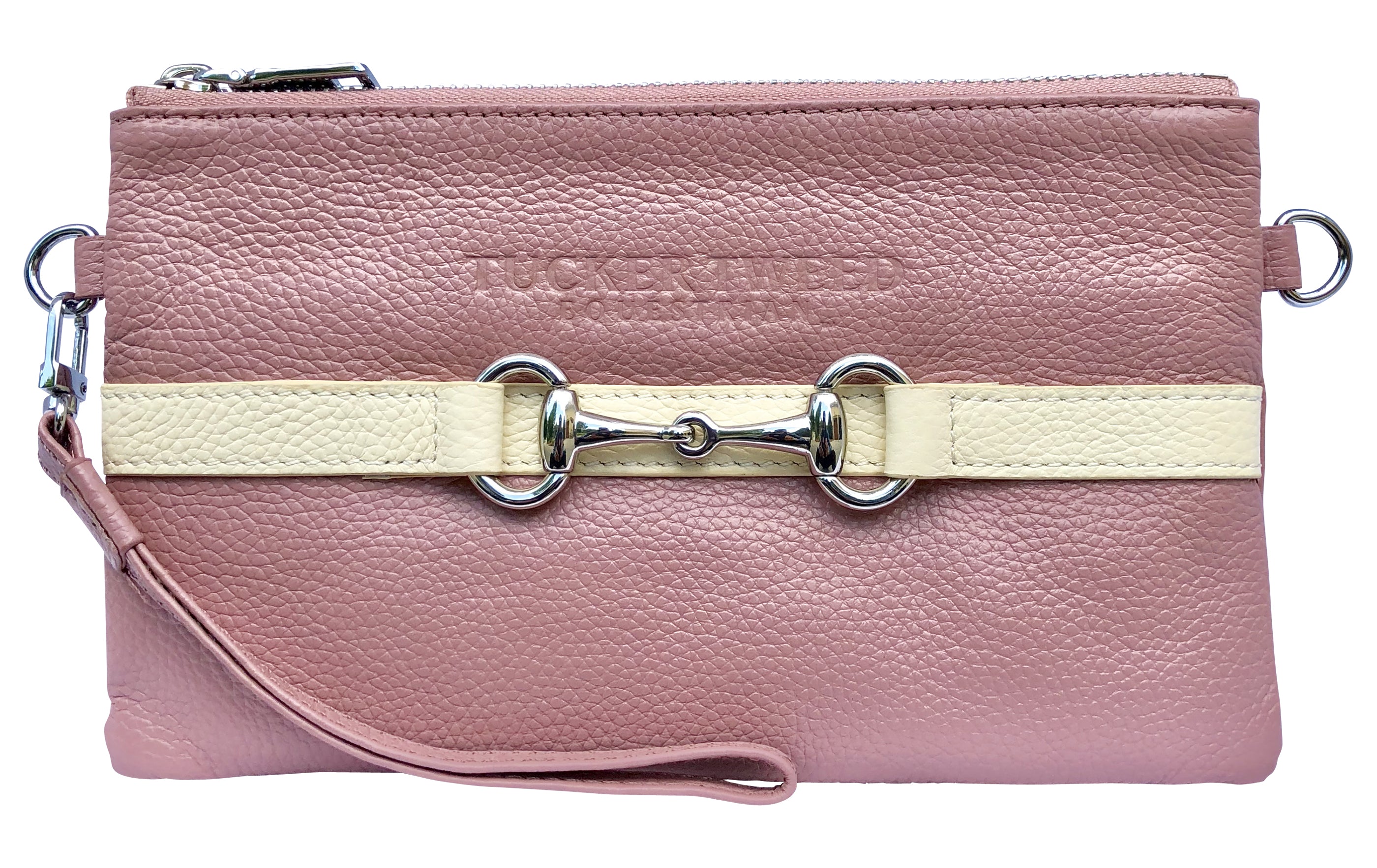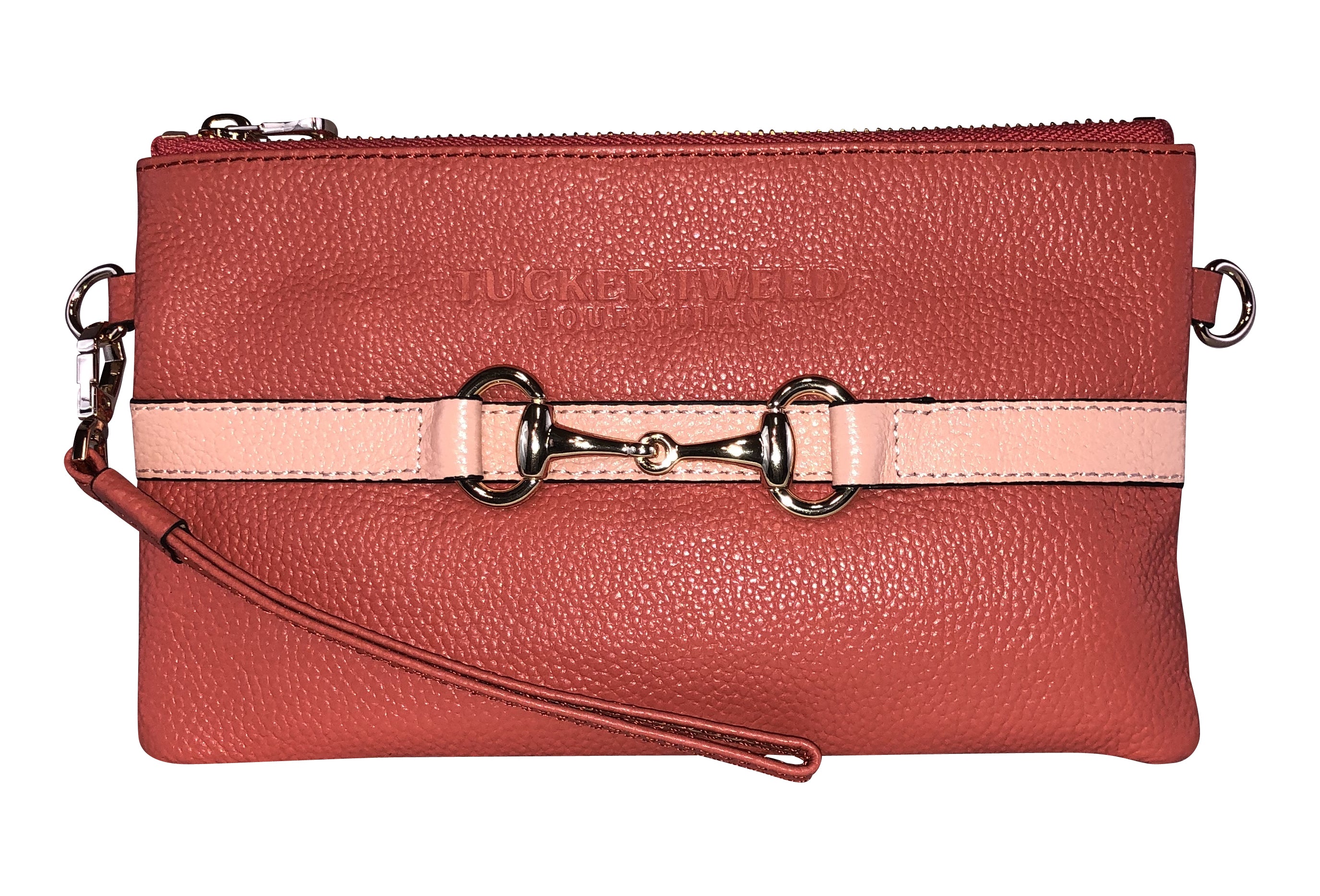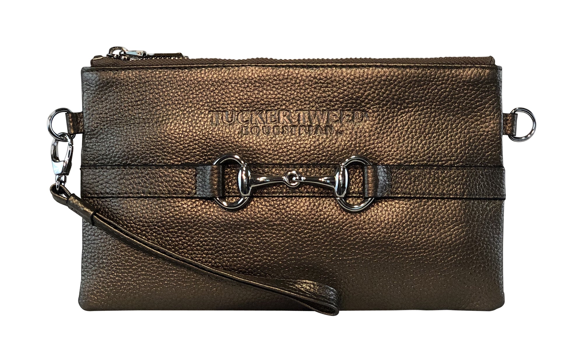Equestrian style meets convenience in the Tucker Tweed Equestrian™ Wellington Wristlet. Fine pebble-grain leather makes a beautiful backdrop for the contrast leather accent strip and snaffle bit detail. The interior is fully lined in the brand’s signature red and features six card pockets, bill pocket, private zipper pocket and room for the largest of cell phones. Zips closed at the top for security. Wristlet strap can be removed to create a clutch carry or reattached on the side or on the zipper. A versatile, simple and useful equestrian luxury.