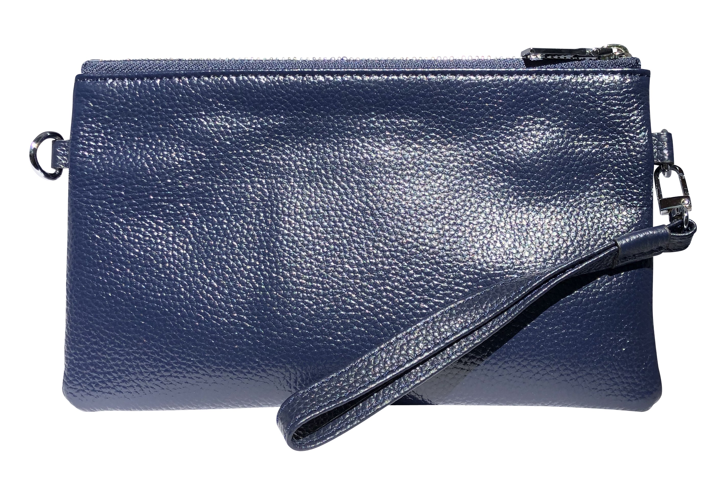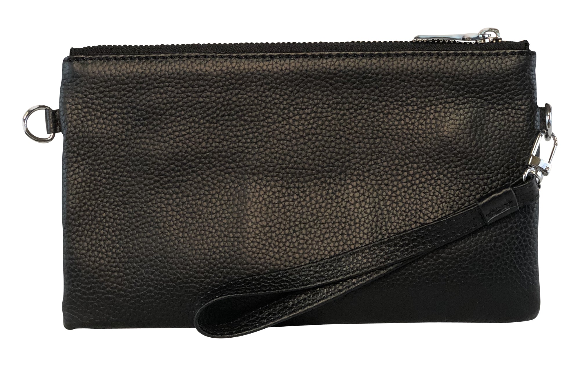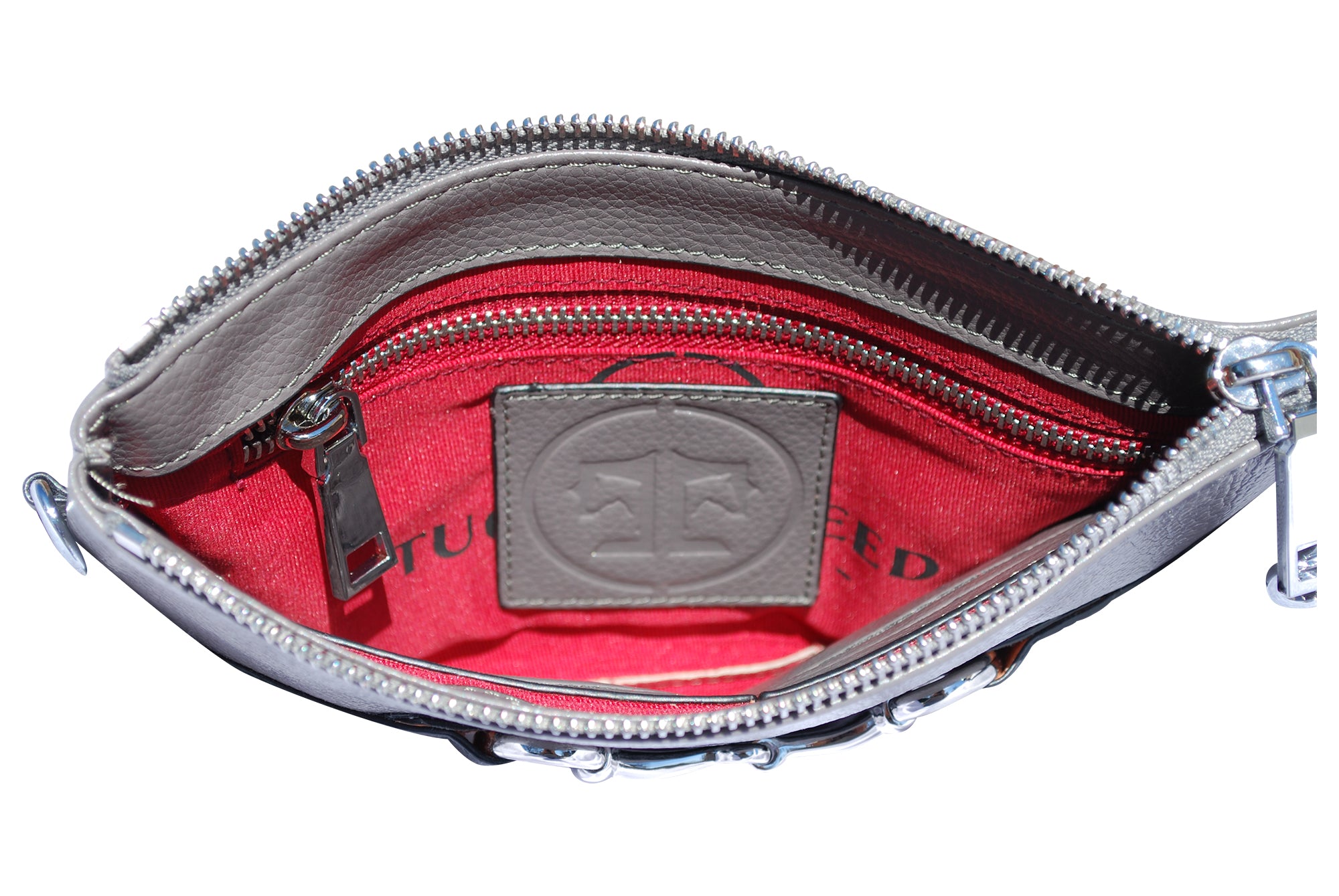 Equestrian style meets convenience in the Tucker Tweed Equestrian™ Wellington Wristlet. Fine pebble-grain leather makes a beautiful backdrop for the contrast leather accent strip and snaffle bit detail. The interior is fully lined in the brand’s signature red and features six card pockets, bill pocket, private zipper pocket and room for the largest of cell phones. Zips closed at the top for security. Wristlet strap can be removed to create a clutch carry or reattached on the side or on the zipper. A versatile, simple and useful equestrian luxury.