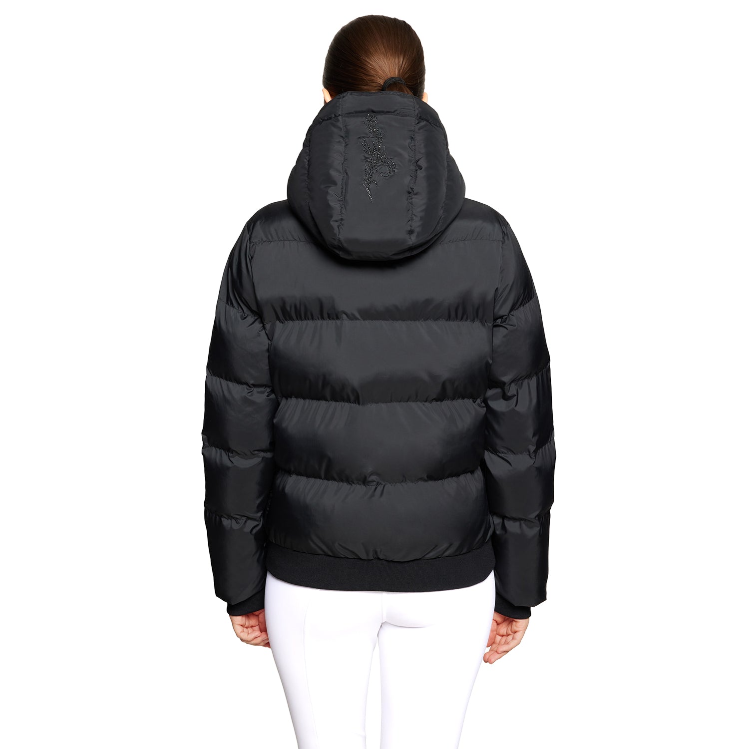 Edgy and sophisticated, the Samshield® Billie Jacket is a puffer jacket with elegant bomber styling. Environmentally friendly insulation is comfortable, waterproof, warm and light. Soft-touch fabric repels water. Removable hood, full zip, double zipped pockets on the front and one pocket on the chest for all your essentials. Samshield blazon in Swarovski® Crystal Intarsia crystals on the front and elastic cuffs. Tone-on-tone Shamshield logo on the back.
