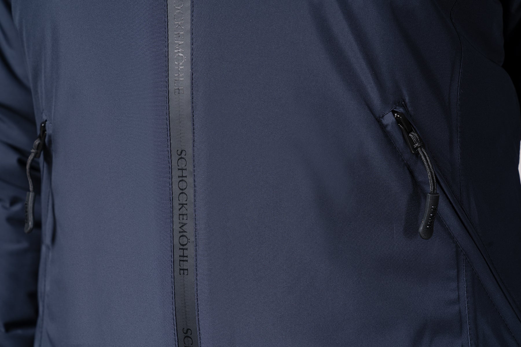The Schockemöhle SpLorena Jacket is a waterproof women’s jacket that blends sporty design with functional features tailored for equestrian life. The quilted and padded lining provides cozy warmth, while the water-repellent two-way zipper with logo offers flexibility and protection in every movement. Two zippered pockets with subtle piping. Ribbed knit cuffs at the hem and sleeves and a high stand-up collar features a hidden hood with elegant logo embroidery. A subtle logo print on the left sleeve and a horse logo print on the chest highlight the jacket’s equestrian identity. Waterproof rating of 3000 mm and breathability of 3000 g/m²/24 h.