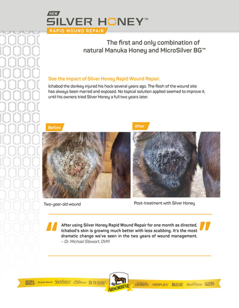 Absorbine® Silver Honey® Rapid Wound Repair Ointment is equine wound care that’s tough on bacteria but gentle on skin. Its revolutionary formula moisturizes the treatment area as it heals and is proven to stop 99.9% of bacteria immediately to start healing faster. It also protects the skin’s natural microbiome, so your horses, ponies and animal companions heal quickly and comfortably. Effective on cuts, abrasions, sores, rain rot, rashes, fungus, scratches, sweet itch, wounds and burns.
