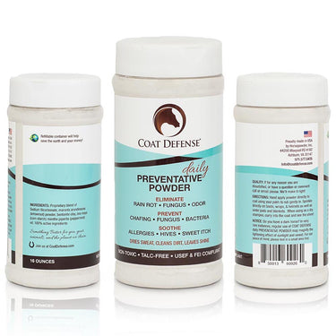Coat Defense® Daily Preventative Powder is a natural and effective solution for helping prevent and treat skin issues in horses, including rain rot, fungus, thrush, scratches, itch and odor. Coat Defense is a game changer as it helps prevent chafing, fungus and pathogenic microbes from taking up residence on a horse and under equipment such as boots, saddle pads and blankets.