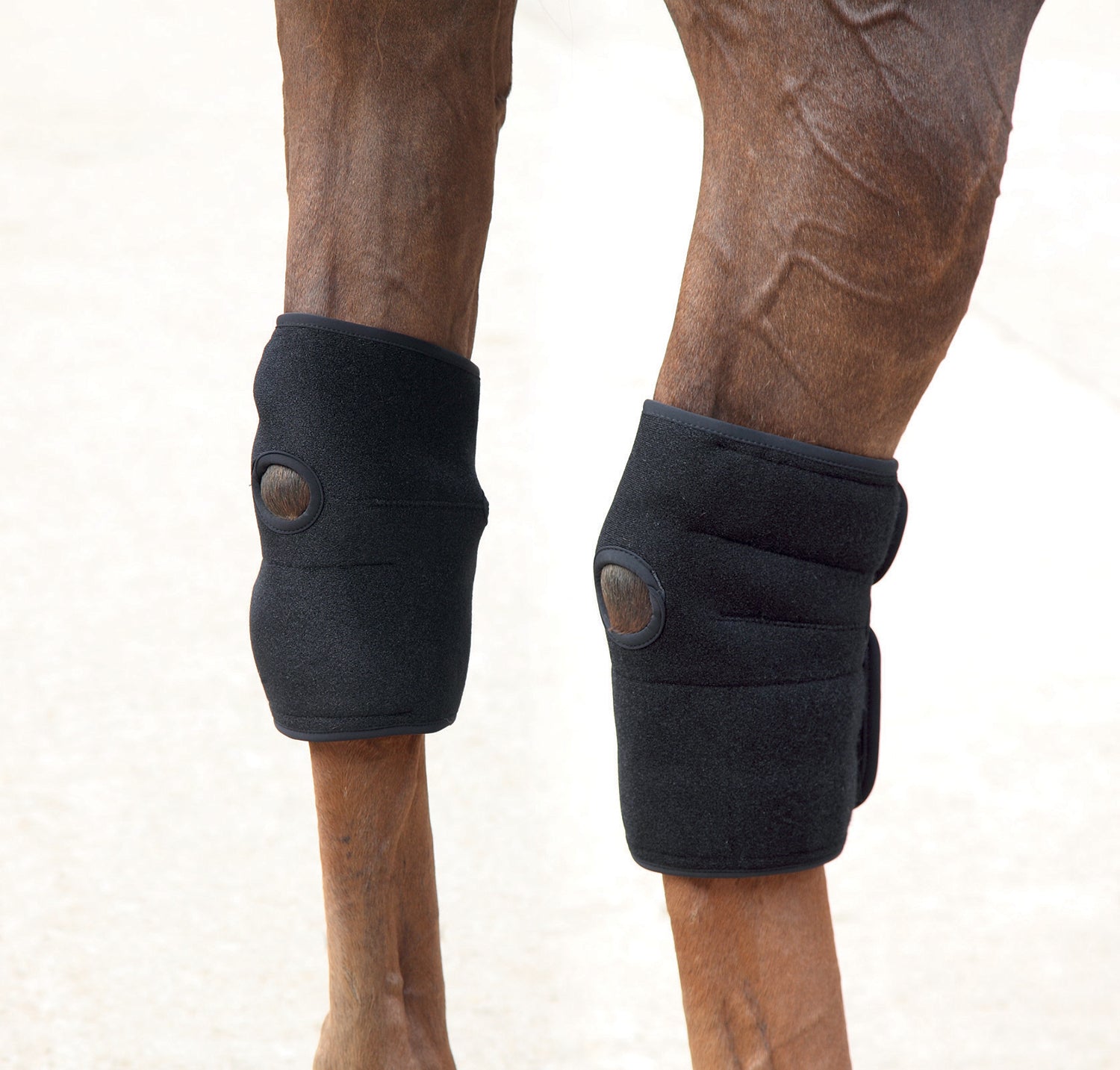Hot/Cold Joint Relief Boots offer flexibility in addressing your horse’s joint aches and pains. Suitable for the knees, hocks or fetlocks, these therapeutic horse boots can be used hot or cold to care for injuries or help speed recovery after strenuous exercise. They can help minimize swelling and inflammation, relieve pain, relax tight muscles, encourage blood flow and ease arthritic conditions. Gel packs can be heated in hot water or a microwave or cooled in water or a freezer. Made of flexible neoprene, the boots are ergonomically designed and shaped with cutout to allow joint movement. Inner pockets keep gel packs secure. Pair.