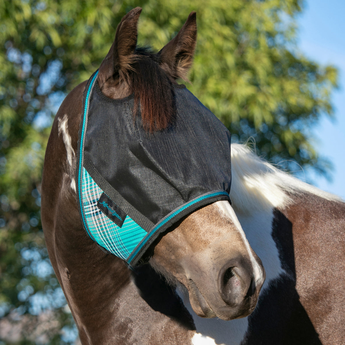 - Blocks 90% UV rays, serving as “sunglasses” for your horse.