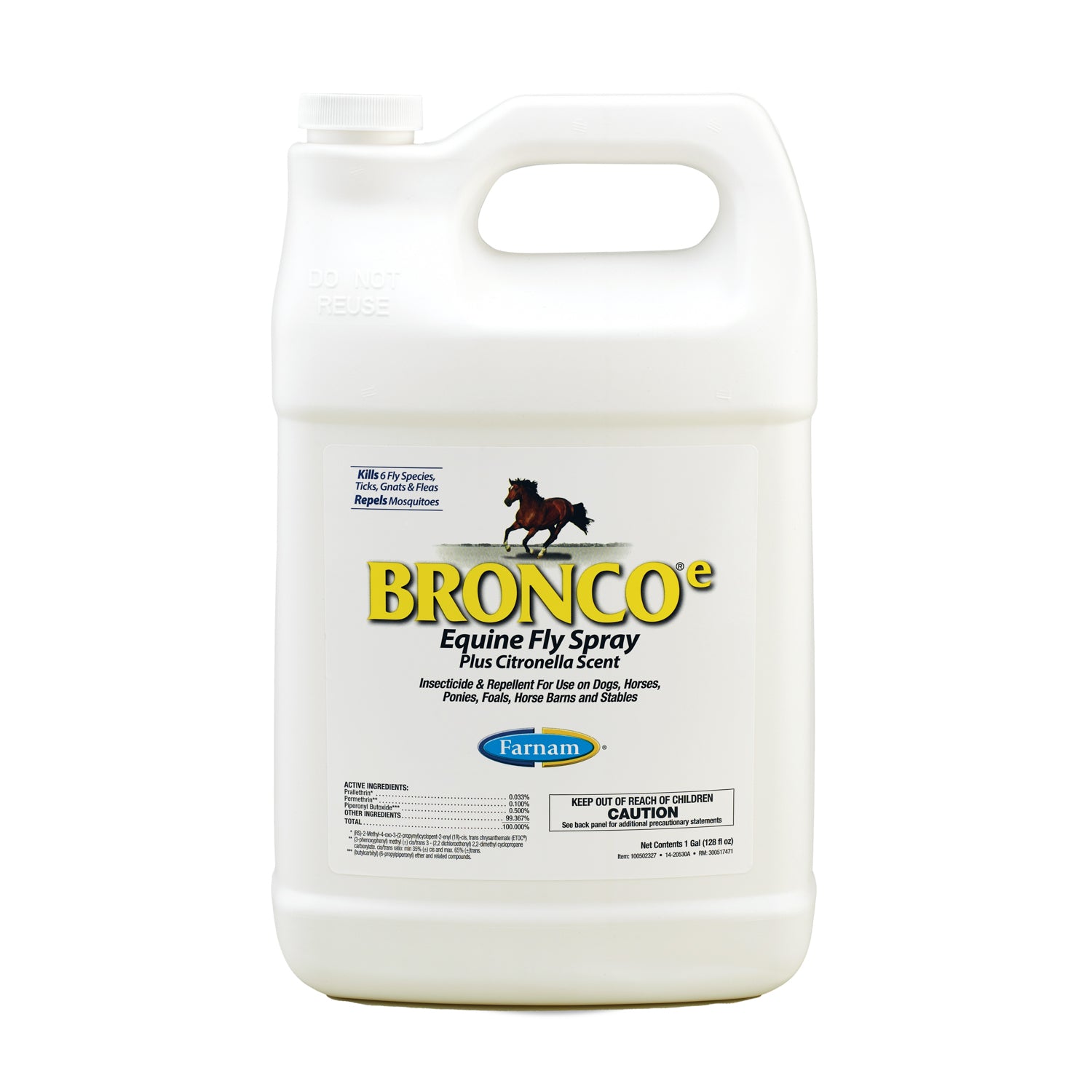 Farnam® Bronco® E Fly Spray, a water-based, ready-to-use pyrethrin and permethrin formula is economical, yet effective. This fly spray repels and kills house flies, horn flies, stable flies, deer flies, horse flies and also mosquitoes, lice and gnats. Also kills fleas and ticks on dogs. Citronella scent makes it pleasant to use. Contains a prallethrin-effective synthetic substitute for natural pyrethrin. Gal.