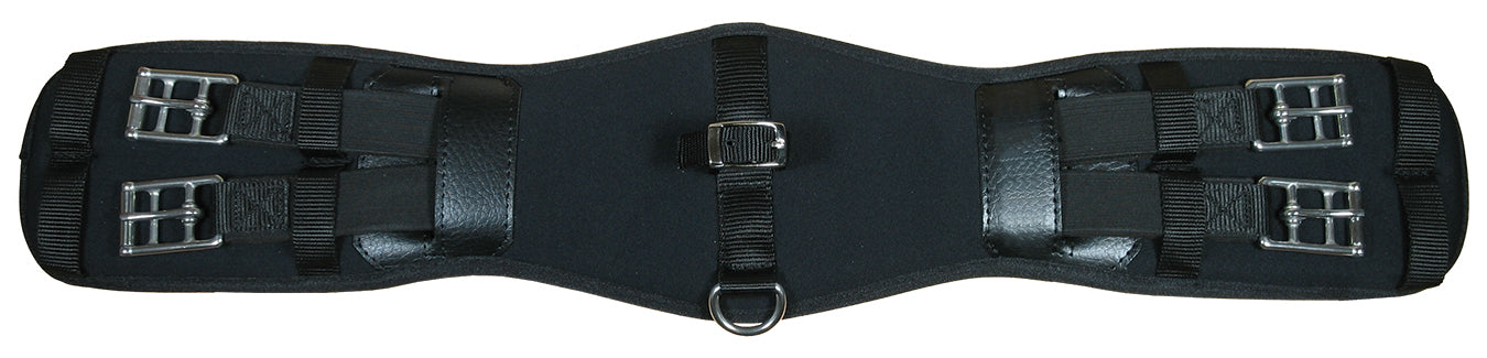 A durable synthetic girth, it features European styling and quality craftsmanship, including stainless steel roller buckles. Elastic ends on both sides ensure stability. Center d-ring allows attachment of auxiliary equipment.