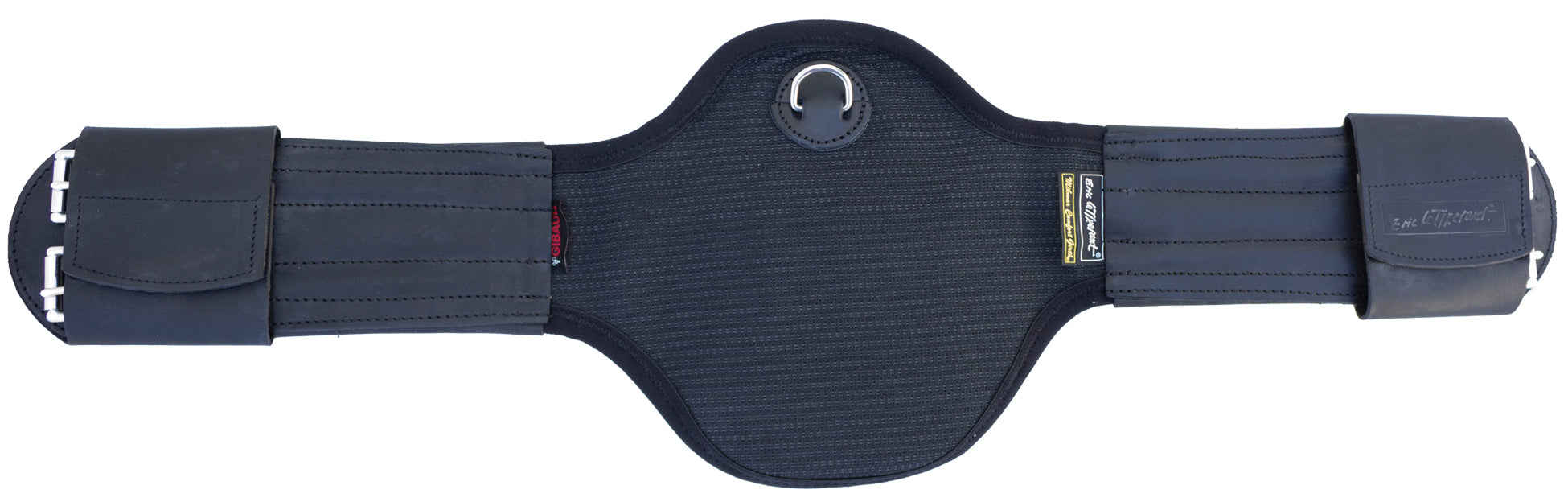 The panel is lined with a natural nonslip alveolar rubber and is positioned over the horse’s sternum to keep the saddle centered and secure and prevent it from slipping. The addition of a special strap interwoven between the Gibaud fabric helps prevents the rider from over-tightening the elastic.