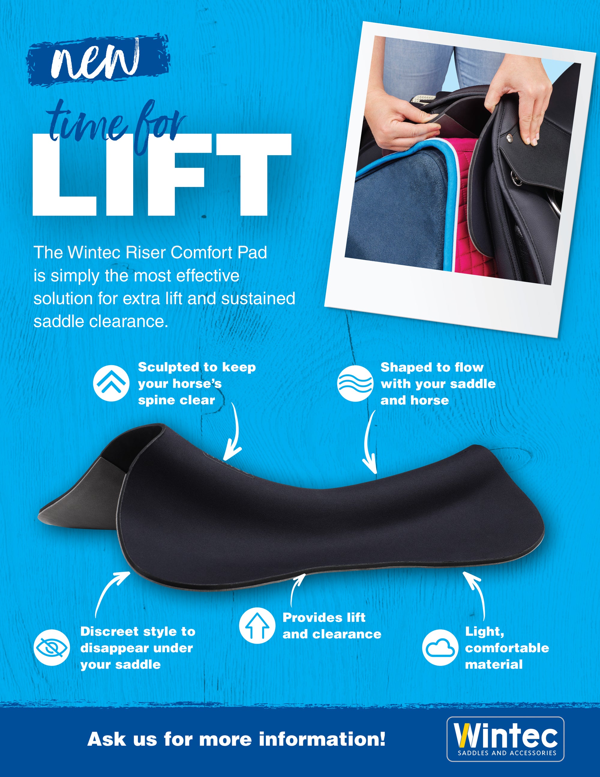 The Wintec Riser Comfort Pad features a discreet, low-profile design that provides lift and clearance along the entire length of the saddle. Its anatomically shaped structure includes a sculpted chamber that keeps the horse's spine clear, ensuring comfort and unrestricted movement without adding unnecessary bulk. Simply the most effective riser pad for extra lift and sustained saddle clearance. For additional clearance, the Wintec Riser Comfort Pad is a game changer!