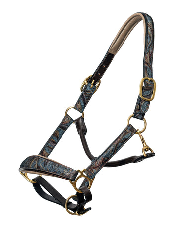 The Halter Ego® Aspen Halter is simply stunning with a unique design and overall quality. Vegetable tanned, European leather with anatomical padded noseband and crownpiece with cutouts alleviates pressure providing ultimate comfort for your horse. Featuring multicolor textured leather with intricate, shades of brown and montana blue. The halter is complimented by a warm taupe padding and bronze patent piping.