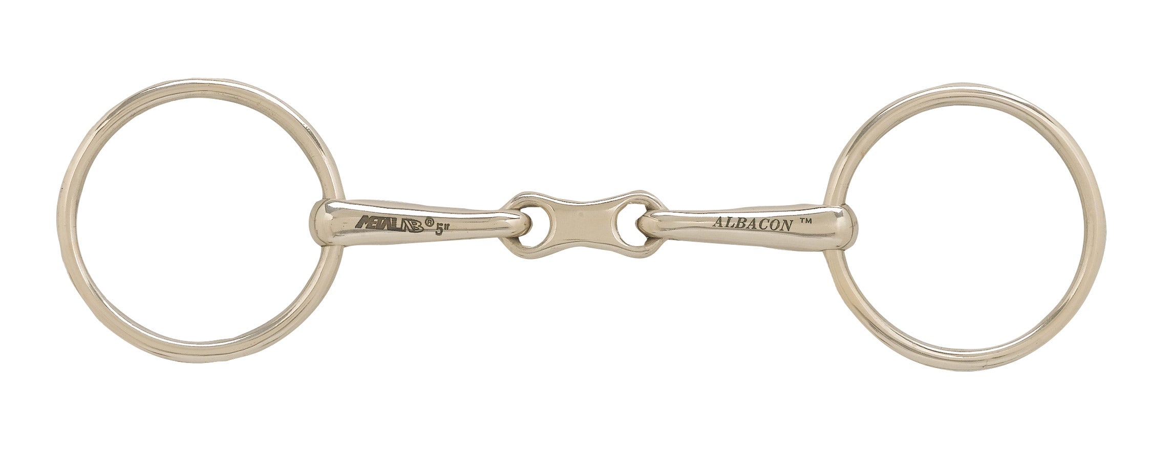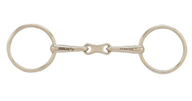 The AlBaCon™ French Link Bradoon Bit is made from copper enhanced German Silver to help stimulate salivation and encourage bit acceptance. The high copper formula also helps prevent dry mouth, yet retains the appearance and durability of German Silver. 13mm mouthpiece with 55mm rings.