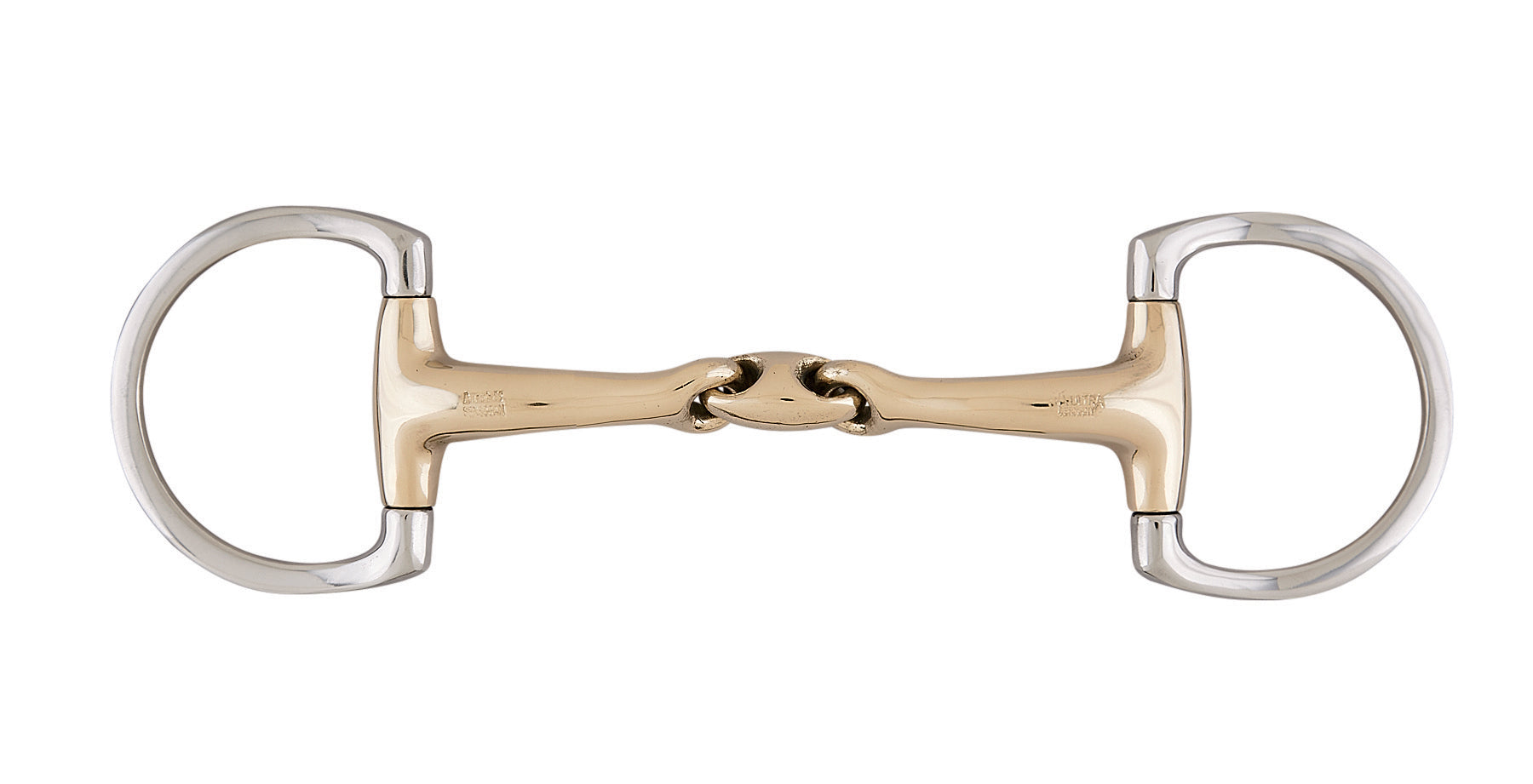 Distinctively unique, this metal is a propriety blend of copper, zinc and manganese. A reduced copper content allows some oxidation to occur, but the addition of manganese regulates and slows oxidation which in turn slows discoloration. Manganese is also an important micronutrient for horses, as a crucial component and activator of enzymes. All Sensogan bits are marked with a black ring at the cheeks.