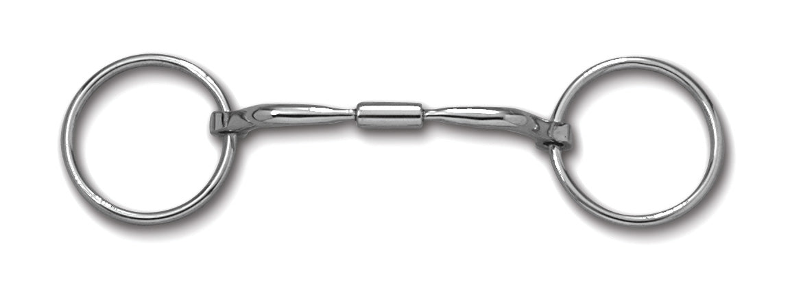 The Myler® Loose Ring Comfort Snaffle MB 02 is a Level 1 loose ring bit intended for horses beginning training. The free-rotating barrel uses mostly tongue pressure and collapses onto the bars. The curved mouthpiece permits the horse to swallow more freely and distributes pressure evenly. Independent Side Movement™ allows the rider to isolate one side of the bit for bending, balancing or lifting a shoulder. Stainless steel with copper inlay. Dressage legal for both USEF and FEI.