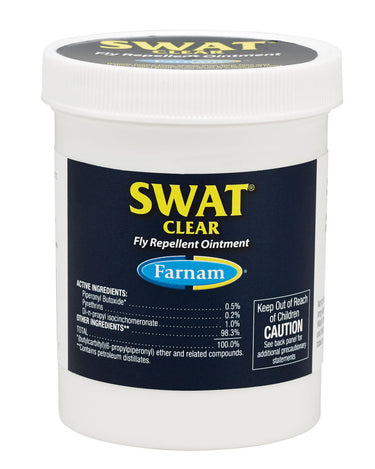 Farnam® Swat® Clear Ointment for horses helps protect wounds and open sores against flies. The botanically-derived pyrethrin formula repels and kills house flies, stable flies, face flies and horn flies without harming wounds. It's ideal for use on the ears and other facial areas, too. 7 oz.