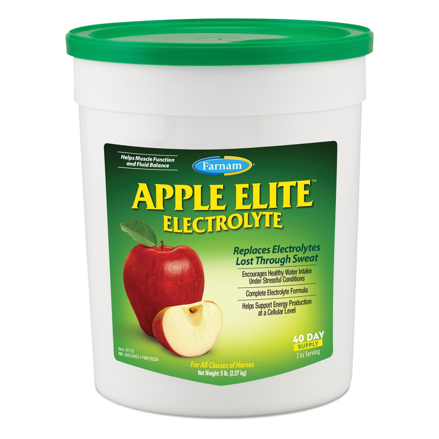 Farnam's Apple Elite™ Electrolyte Powder is an electrolyte and trace mineral supplement. Provides the needed electrolytes to maintain depleted body fluids if your horse is under stress or in hard training or competition. Delicious apple-flavored granules deliver sodium, calcium, potassium, magnesium and trace minerals - nutrients that may be lost by dehydration. Great for competition, working and endurance horses. These delicious electrolytes are in granulated form to make feeding easy.