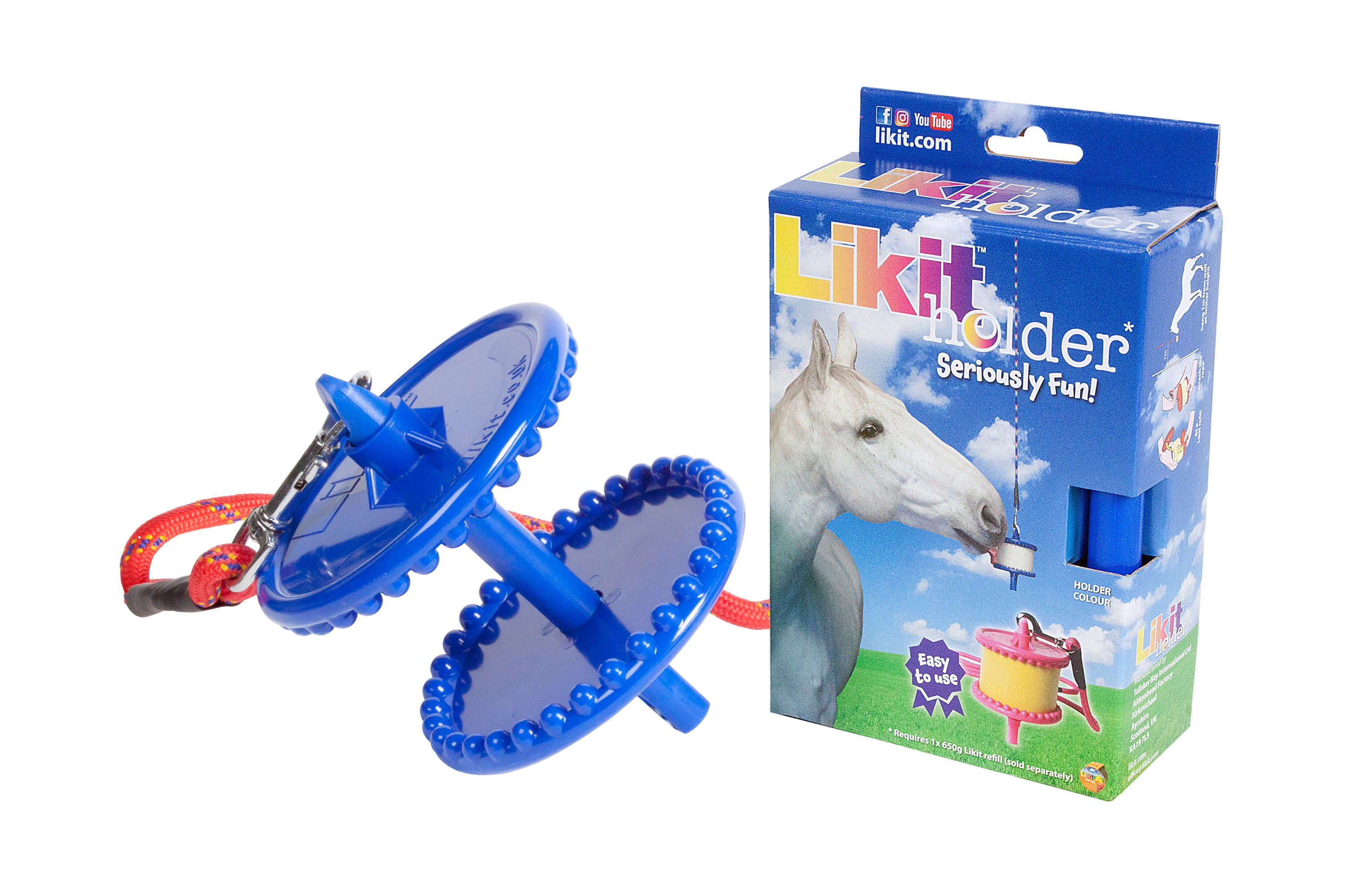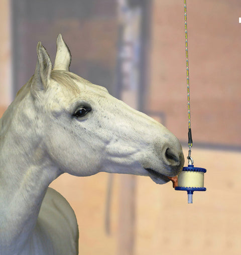 The Likit™ Holder comes on a rope and is designed to be hung freely in a stall. This toy holds one Standard Likit, sold separately. As your horse plays with the toy, the Likit Holder moves to present an entertaining challenge to retrieve the tasty treat.