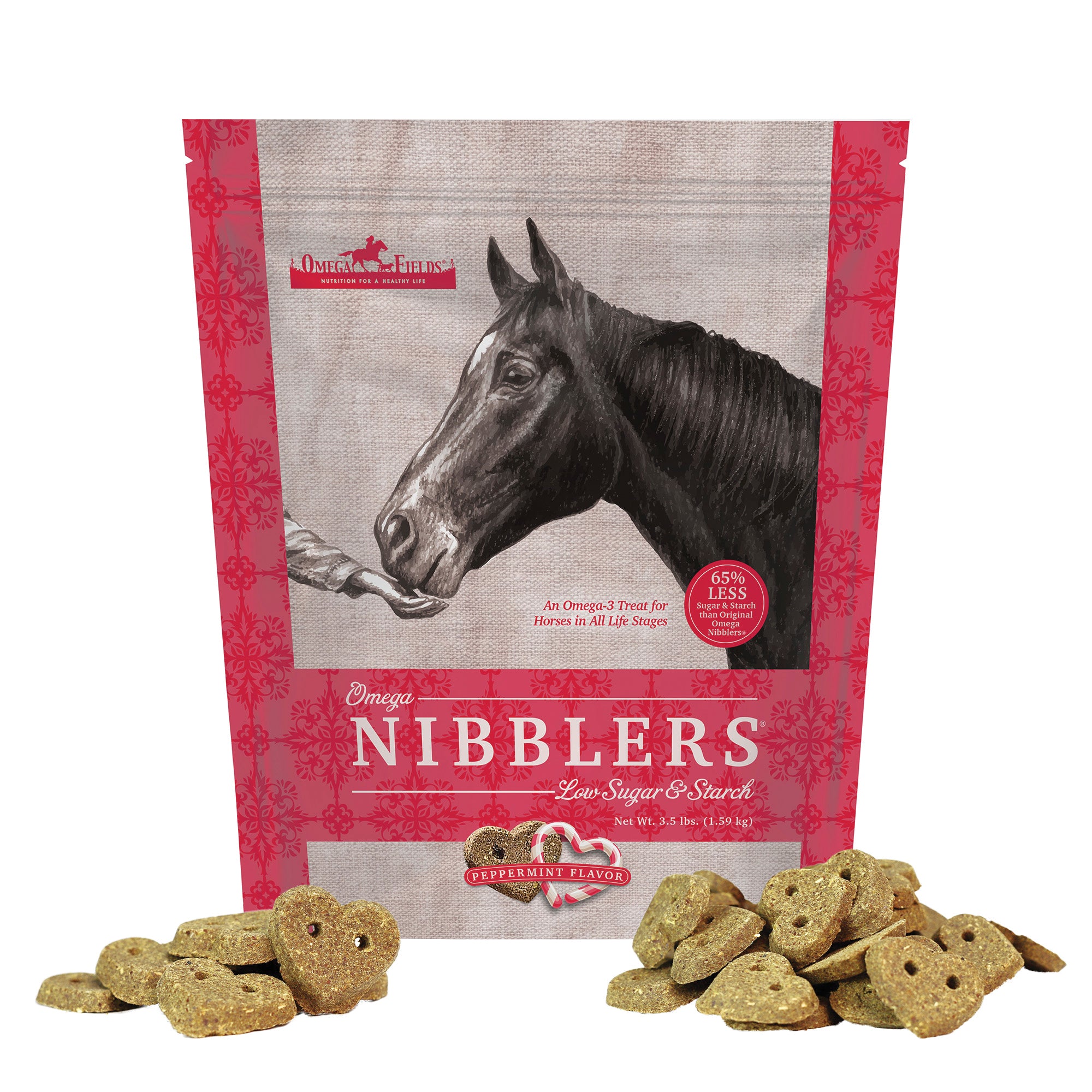 Omega Nibblers® Low Sugar & Starch formula by Omega Fields® is an all-natural, peppermint-flavored supplement in the form of heart-shaped horse treats. These perfectly sized treats are low in non-structural carbohydrates: 6.7% sugar and 7.4% starch (63% less sugar & starch than original Omega Nibblers).
