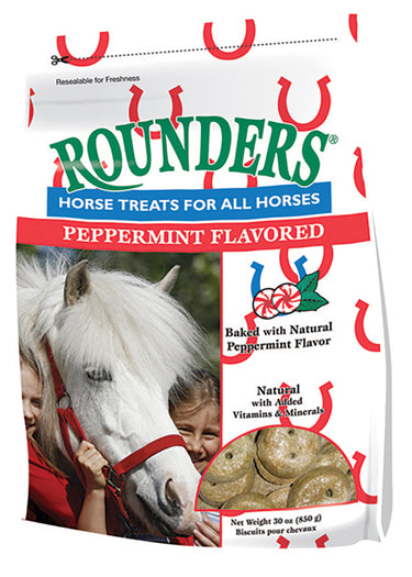 Rounders® Peppermint Horse Treats are all-natural rewards for your horse. Fortified with vitamins and minerals, these horse cookies contain real peppermint oil and offer a unique taste that horses and ponies can't resist. Fun to feed and easy to carry in your pocket. 30 oz.