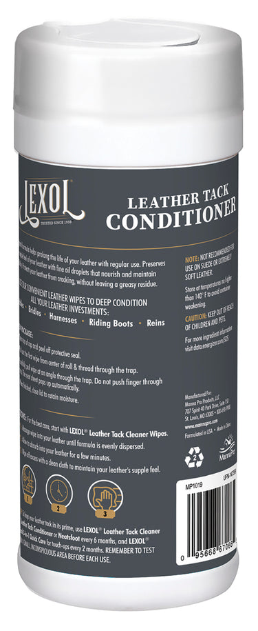 Lexol® Leather Conditioner Wipes are an easy way to care for your leather tack. 26 pre-moistened towels condition and preserve your leather, helping to maintain its strength, beauty and flexibility. These conditioning wipes also help restore resiliency to old or neglected leather that has become hardened and stiff. The formula is an emulsion much like that used in leather tanning, and it restores the essential oils that nourish and protect leather.