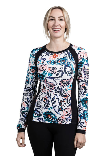 The Kastel Denmark Ladies’ Izzy Long Sleeve Shirt is a contemporary crewneck top made of Kastel’s signature ikat print with flattering black panels at the sides. The soft, four-way stretch fabric rated UPF 30 pairs with cooling mesh under-sleeve panels to provide comfort. Antibacterial properties resist odor buildup. Four-way stretch and raglan sleeve construction allow you to move freely.