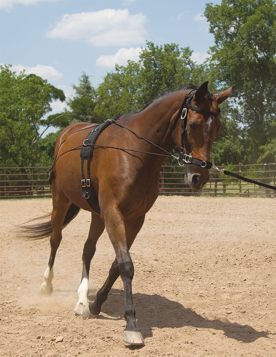 The Balance Complete Training System is designed to help develop proper head set and balance while strengthening back and neck muscles. It’s a complete system with surcingle, caveson and loose ring bit. Hanger and rope rigging included.