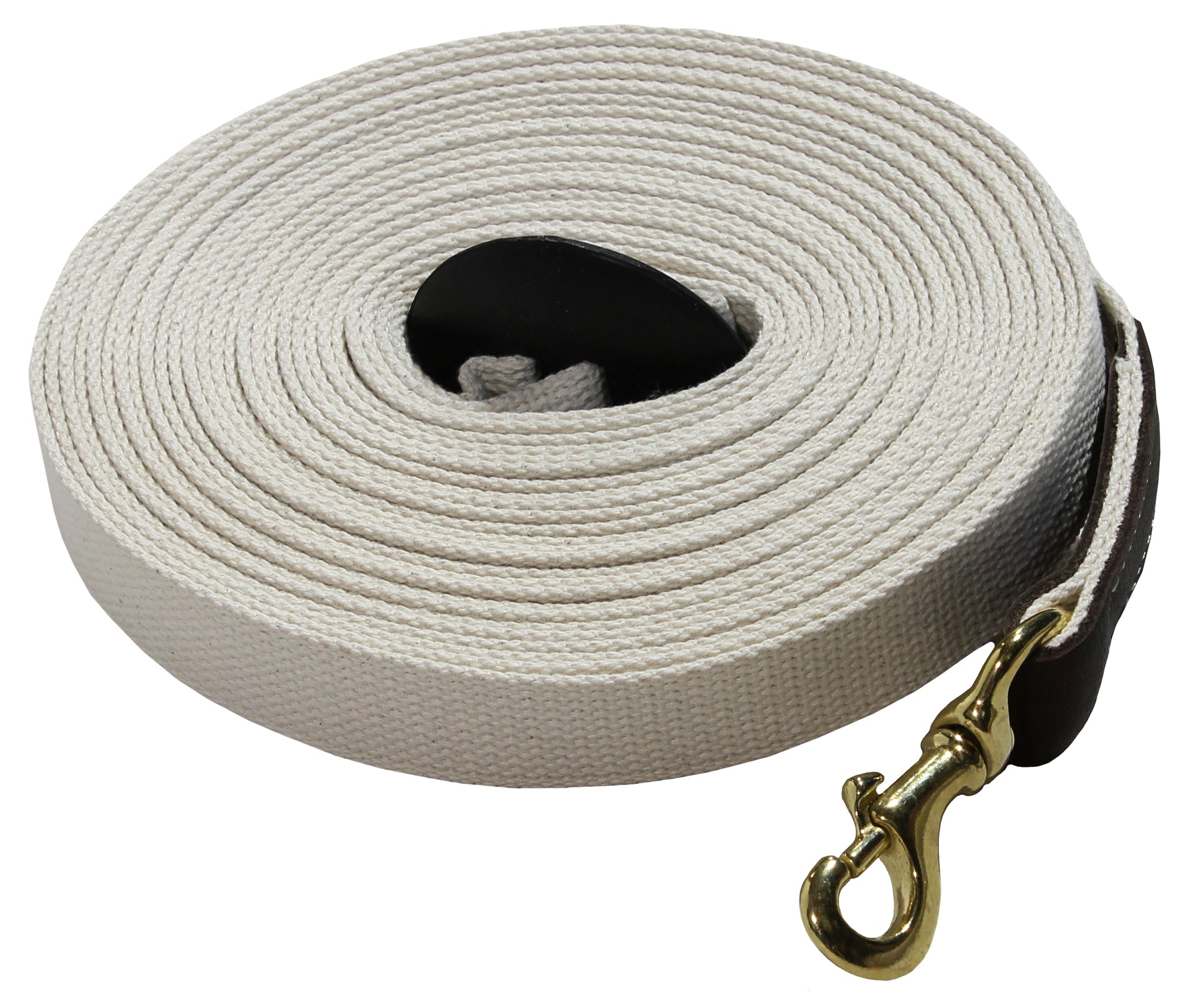 The Suffolk™ Premium Lunge Line is made of top quality cotton webbing that feels secure in the hand and stands up to use. Rubber stop on one end and durable brass swivel snap on the other. 35' long.