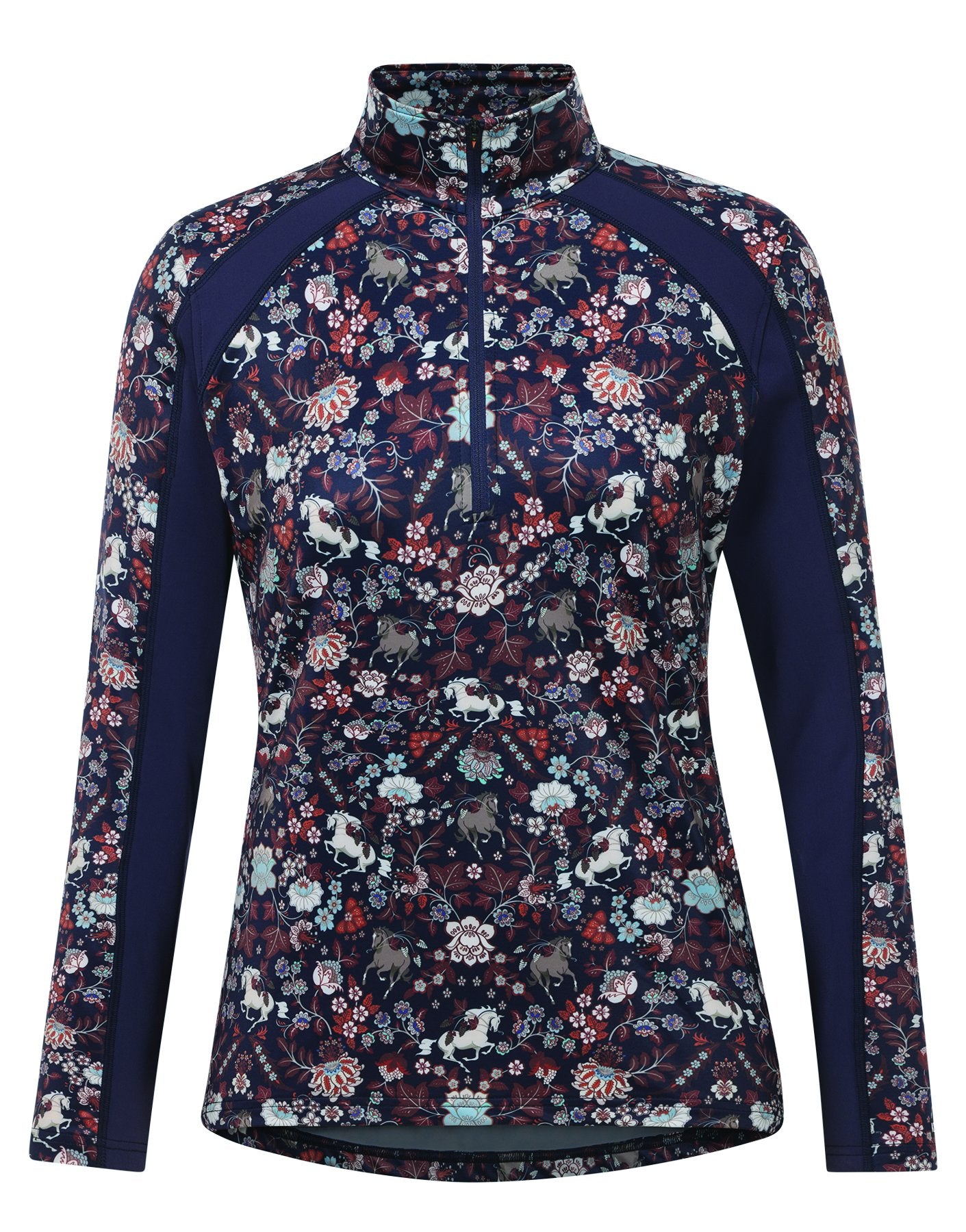 Designed with exclusive equestrian prints that celebrate the spirit of riding, this Kerrits® First Level Quarter-Zip Tech Top offers lightweight, breathable warmth in a technical four-way stretch knit for a functional, performance fit. Its smooth exterior sheds hay, horsehair, and dirt, while the lightly fleeced interior provides added comfort. Sporty contrast panels and flat-seam construction create a flattering silhouette and smooth fit. The quarter-zip design allows for easy temperature control and versatile layering throughout changing seasons.