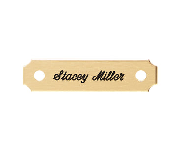 Our 2" Notched Corner Bridle Nameplate in brass is a classic label for your horse’s bridle. The nameplate will be engraved in the USA in your choice Block, Old English, Roman or Script letters with your horse’s name, your name or your farm’s name. Predrilled 5/32" holes fit rivets for attachment. Two sizes of rivets are included to allow you to attach the nameplate to either a padded or flat leather bridle. Personalized items are not returnable.